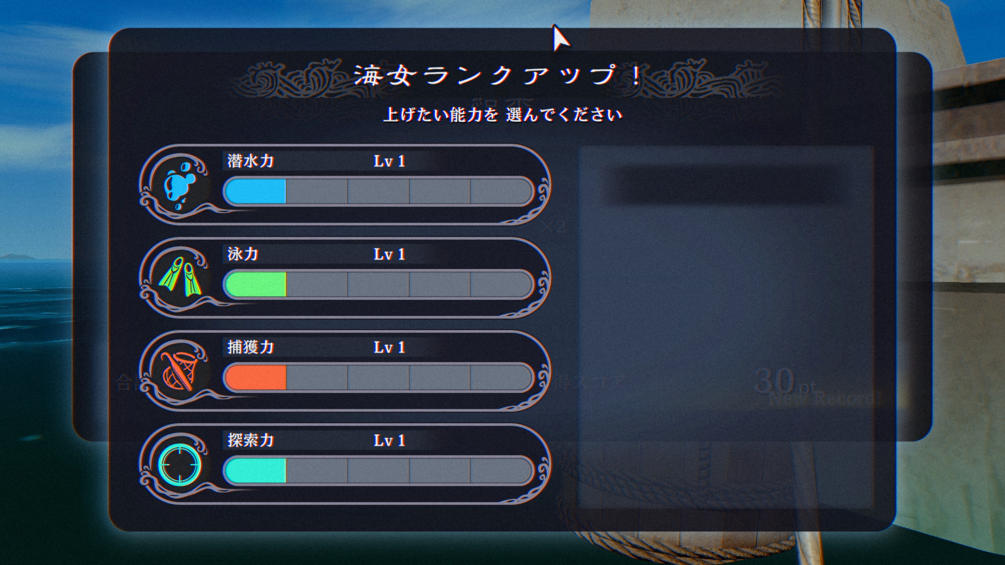 海女ランクアップ潜水力をLv1→2に、チュートリアルで何度もできるが、すぐ本番やった方が早い。