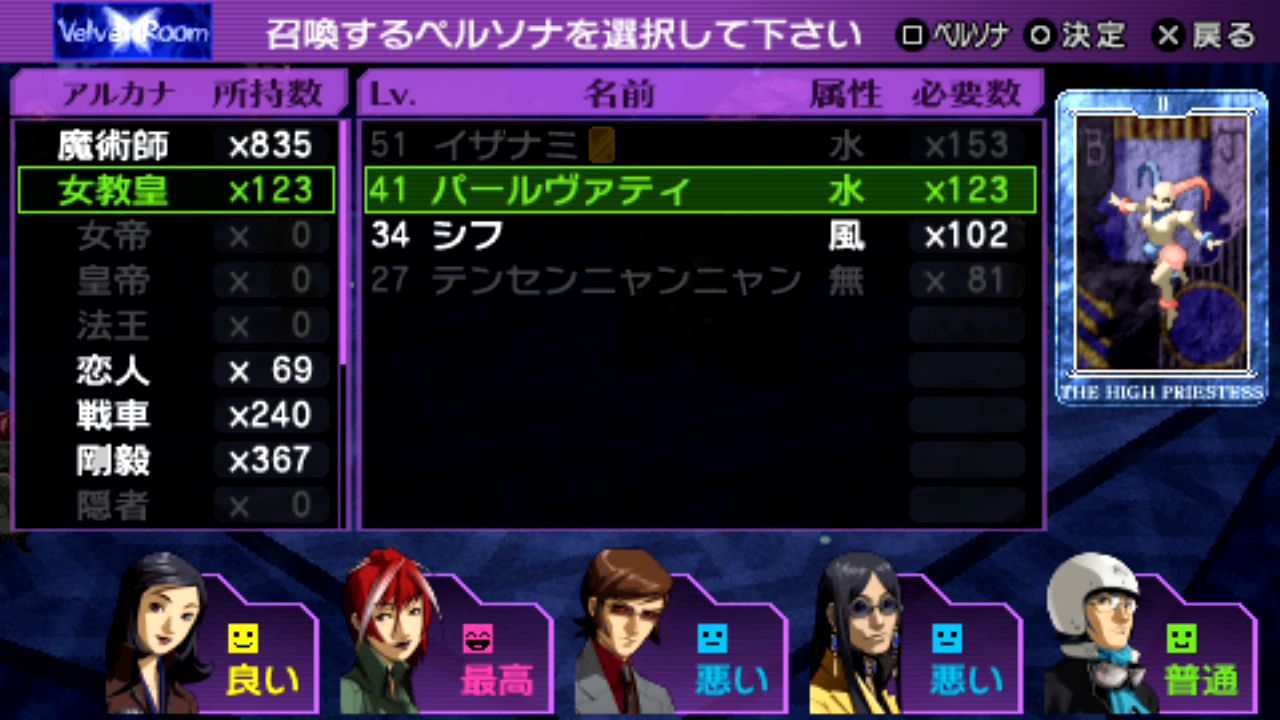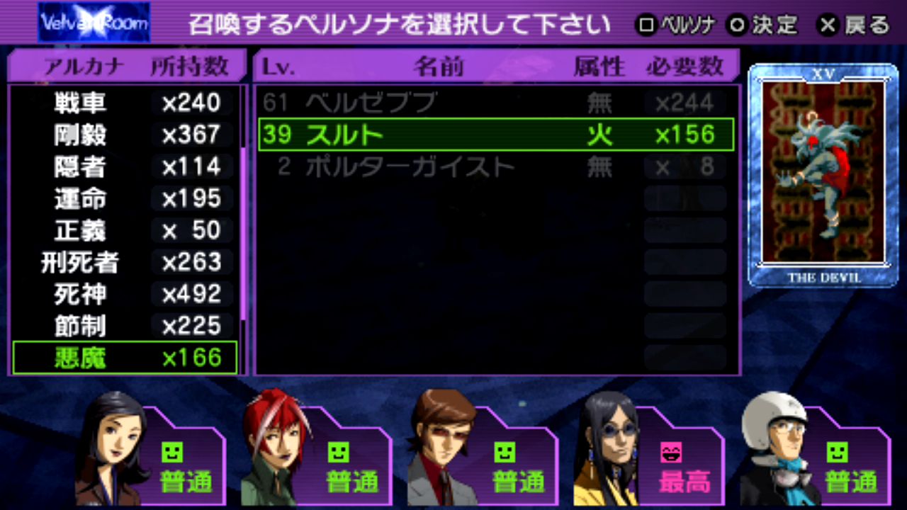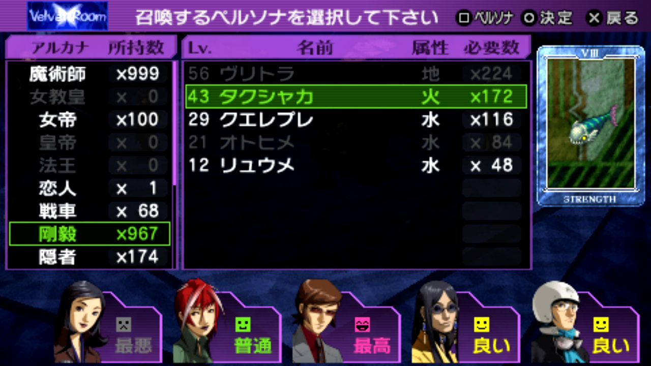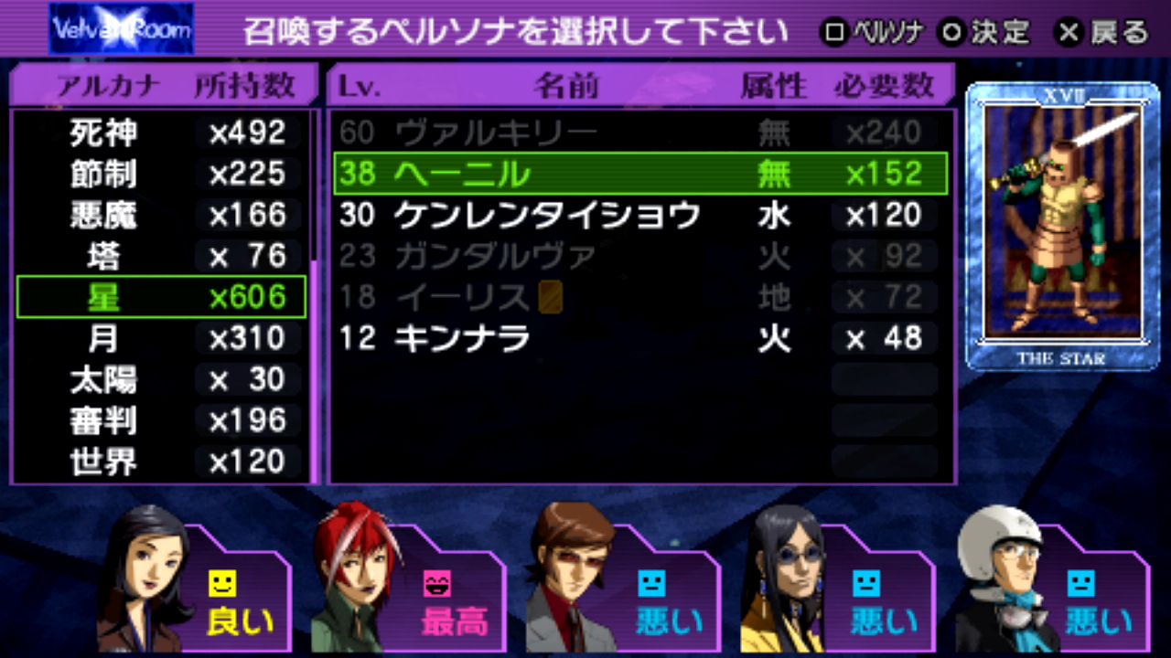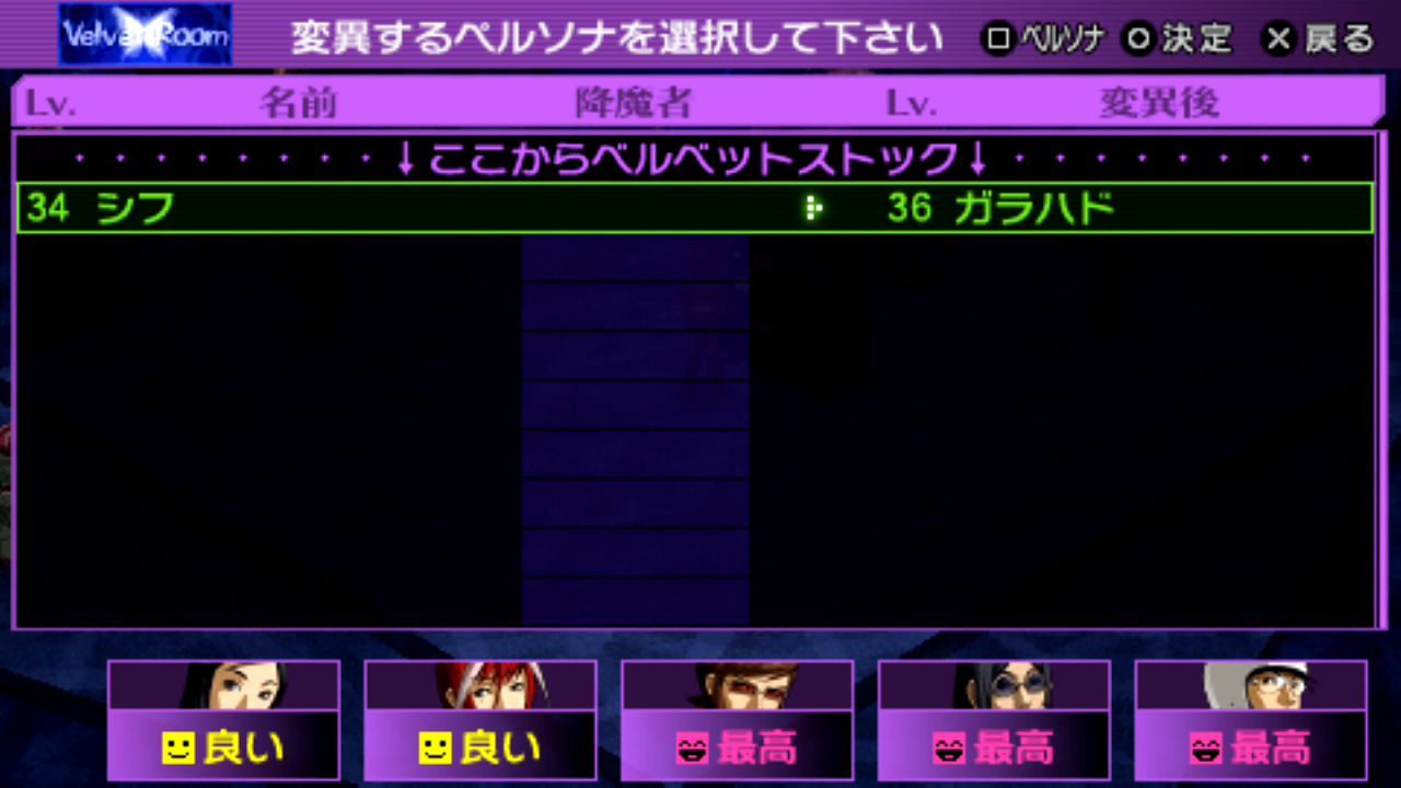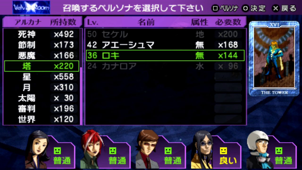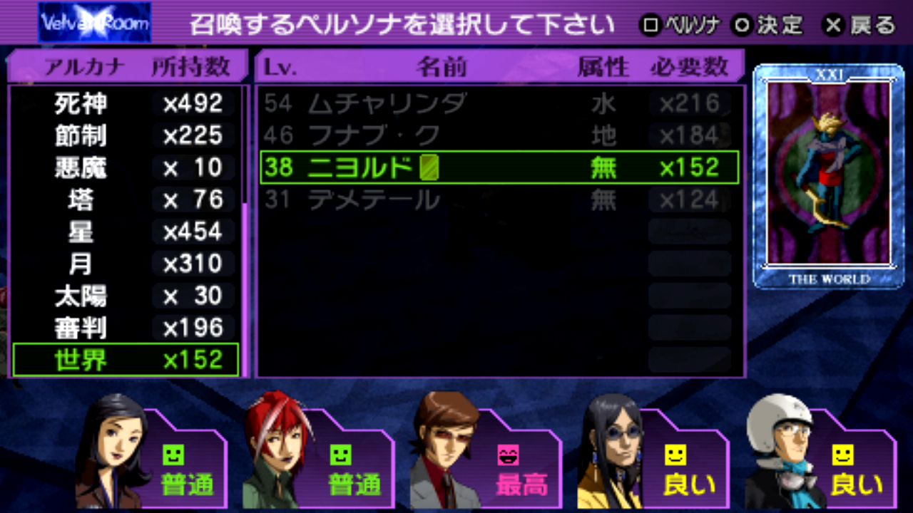女教皇シフLv.34、女帝セイオウボLv.36、塔ロキLv.36、皇帝バールLv.37、節制スチュパリデスLv.37、星ヘーニルLv.38、世界ニヨルドLv.38、法王ヤマLv.39、悪魔スルトLv.39、隠者ゲンブLv.40、女教皇パールヴァティLv.41、刑死者バルバトスLv.41、恋人ヴィヴィアンLv.42、塔アエーシュマLv.42、戦車スサノオLv.43、剛毅タクシャカLv.43、死神アンクウLv.44