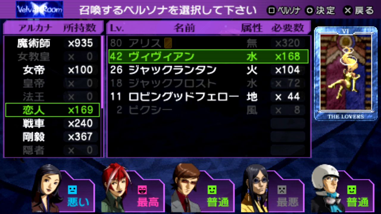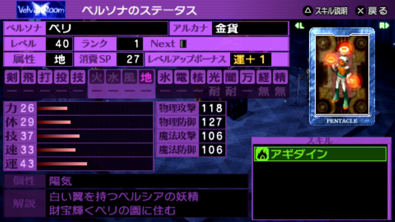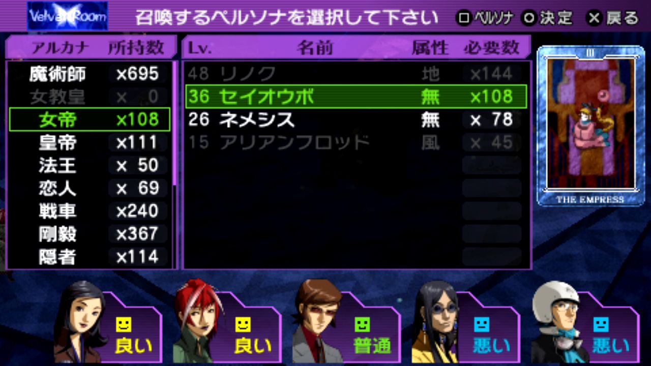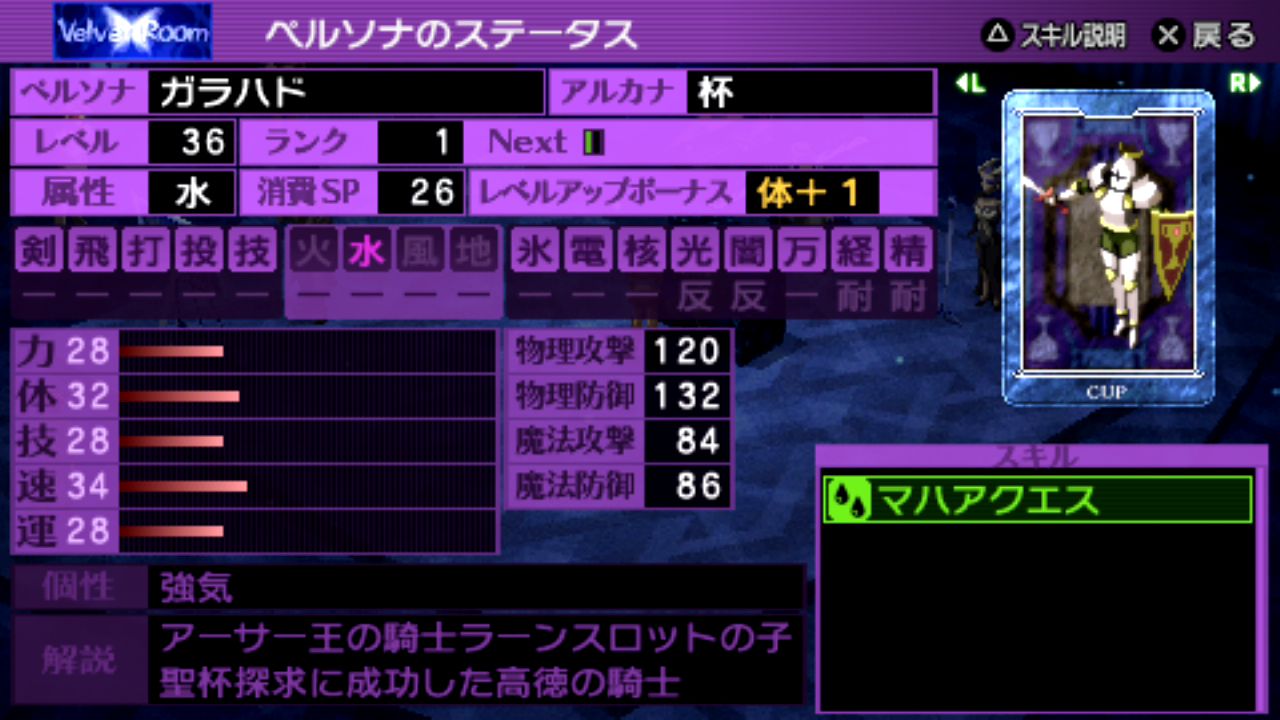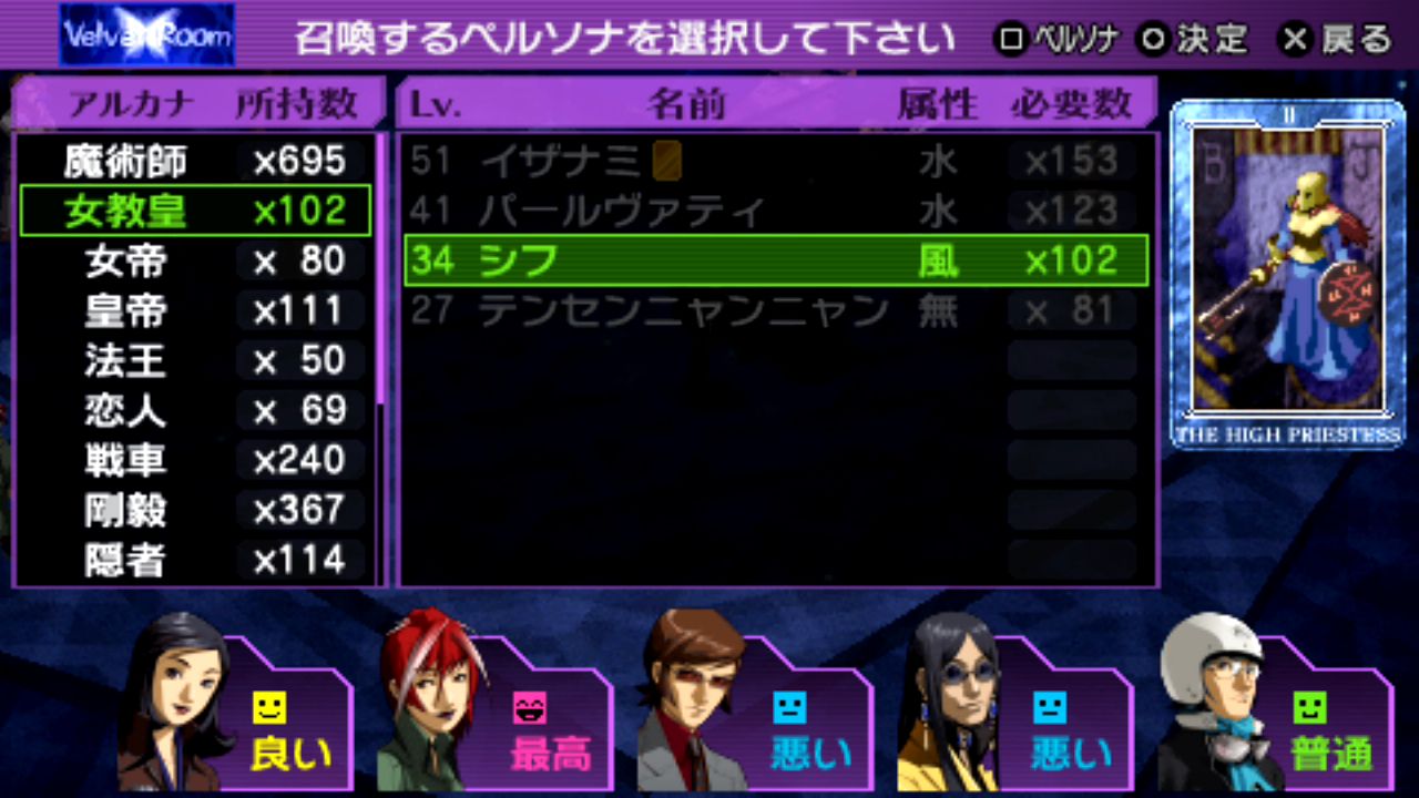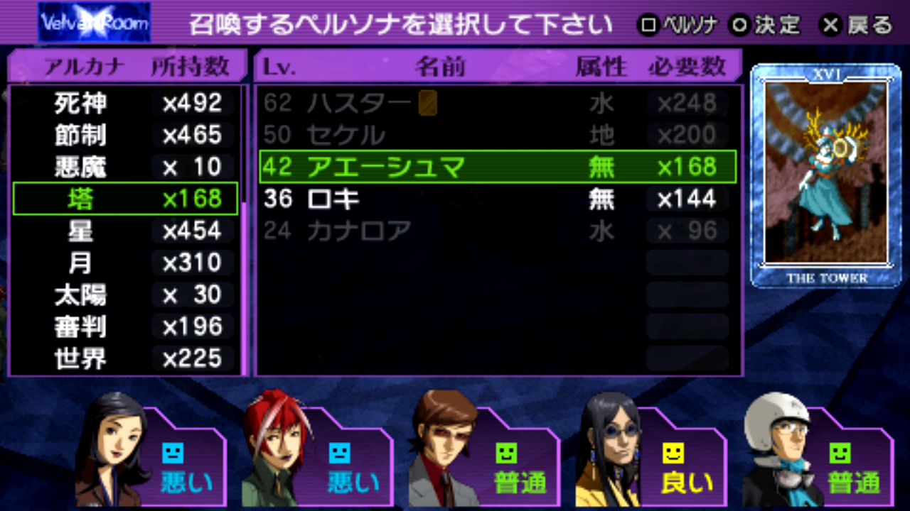 女教皇シフLv.34、女帝セイオウボLv.36、塔ロキLv.36、皇帝バールLv.37、節制スチュパリデスLv.37、星ヘーニルLv.38、世界ニヨルドLv.38、法王ヤマLv.39、悪魔スルトLv.39、隠者ゲンブLv.40、女教皇パールヴァティLv.41、刑死者バルバトスLv.41、恋人ヴィヴィアンLv.42、塔アエーシュマLv.42、戦車スサノオLv.43、剛毅タクシャカLv.43、死神アンクウLv.44