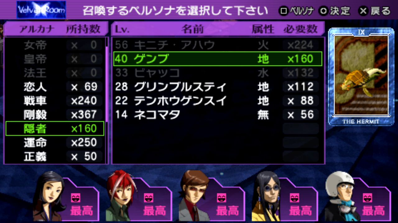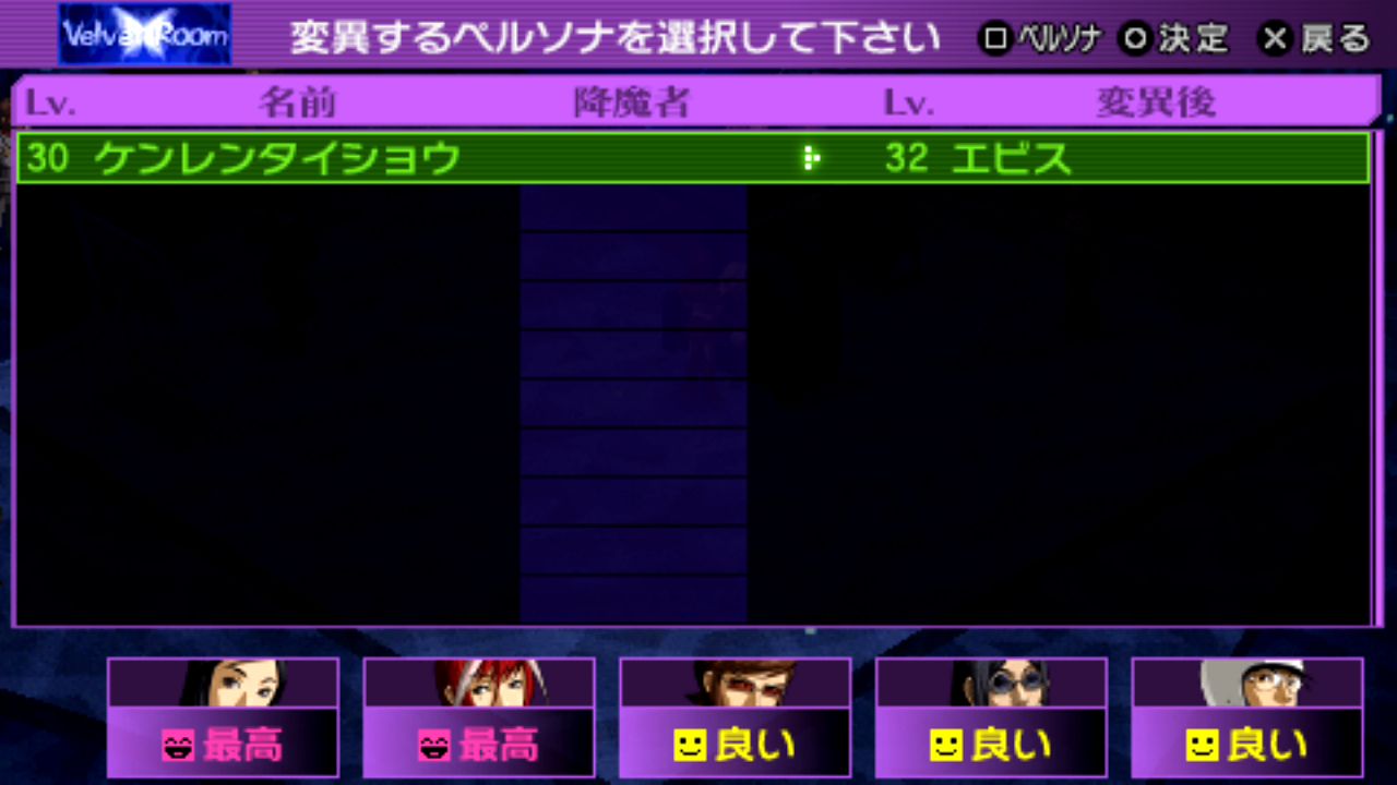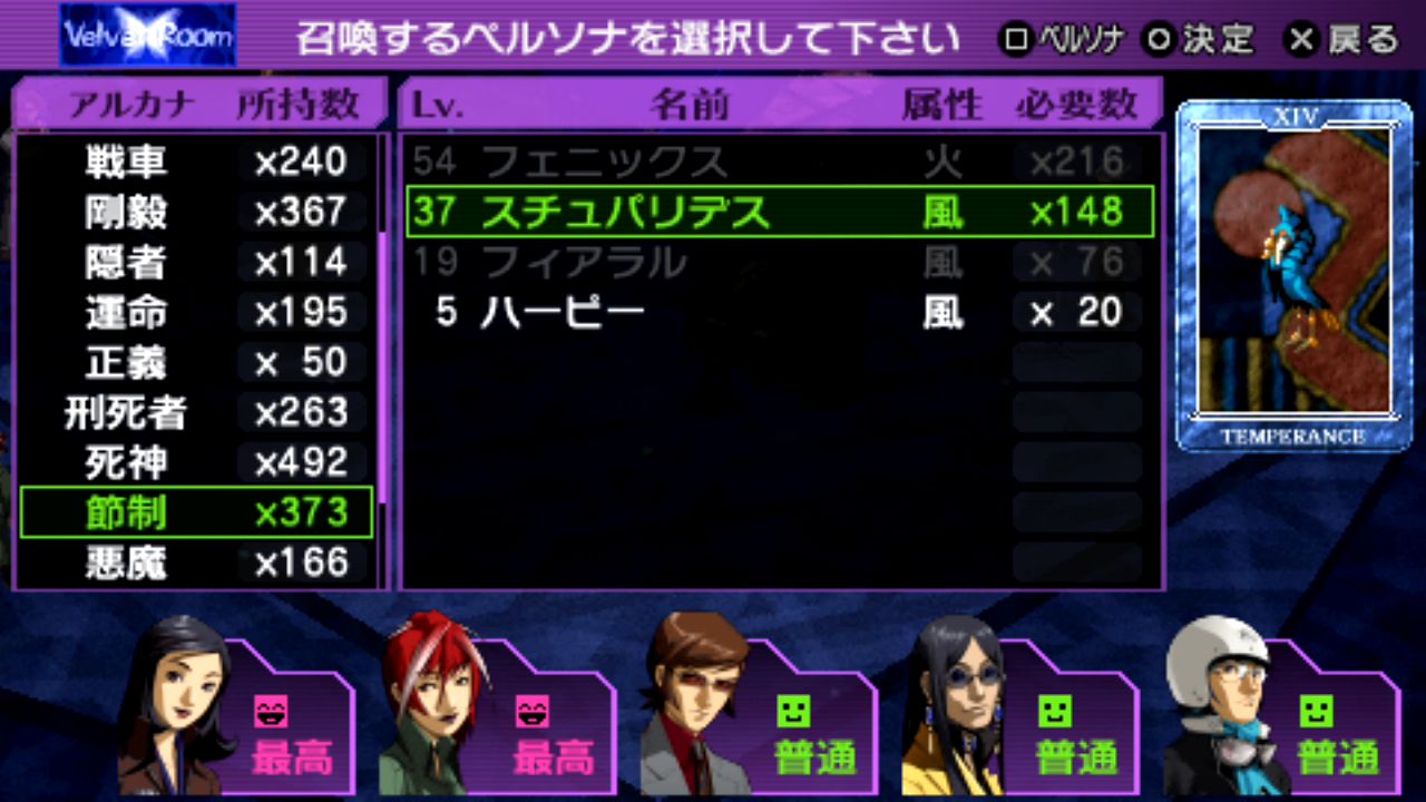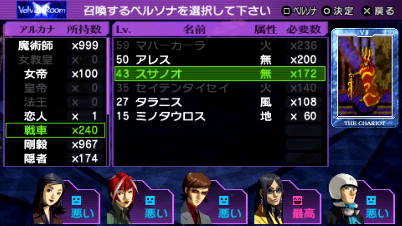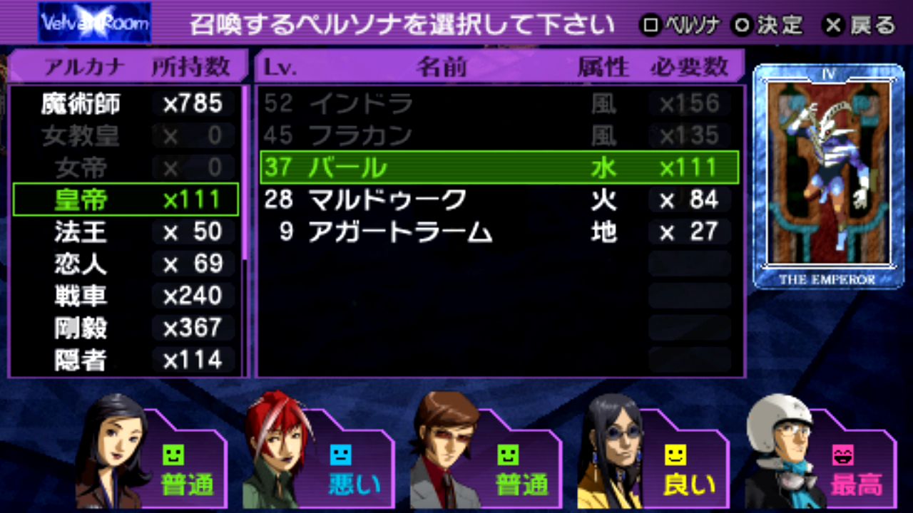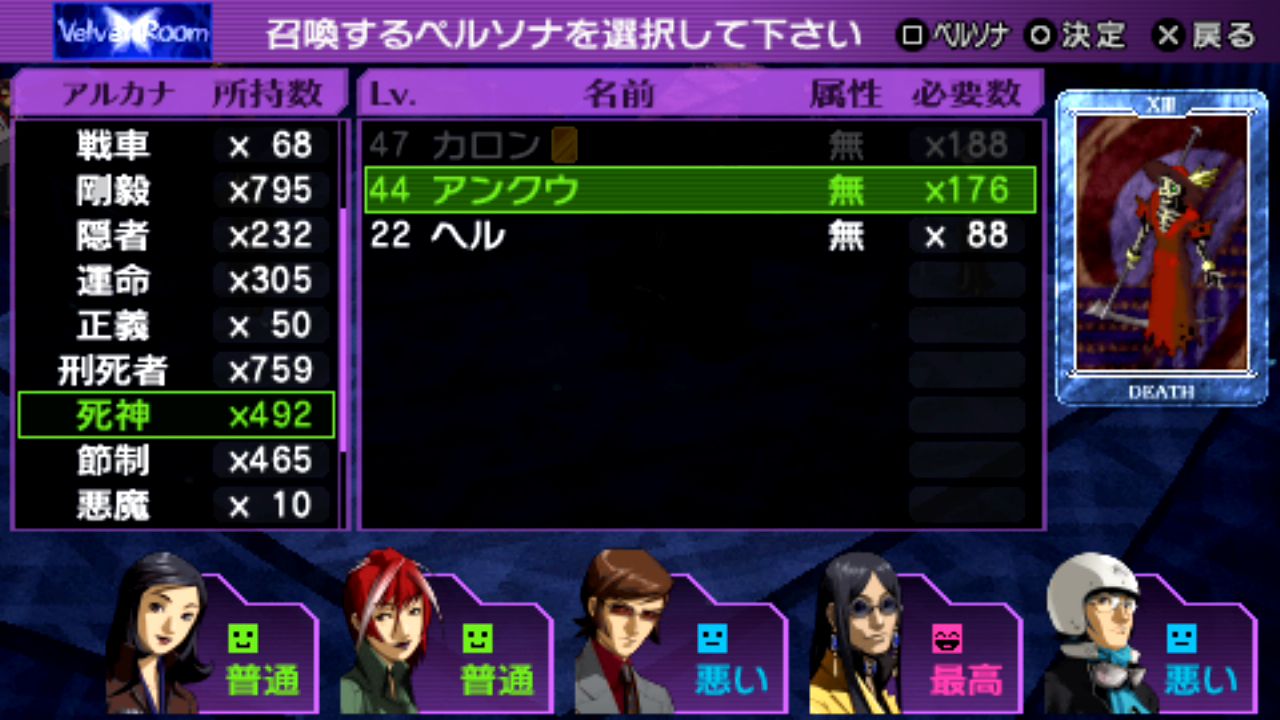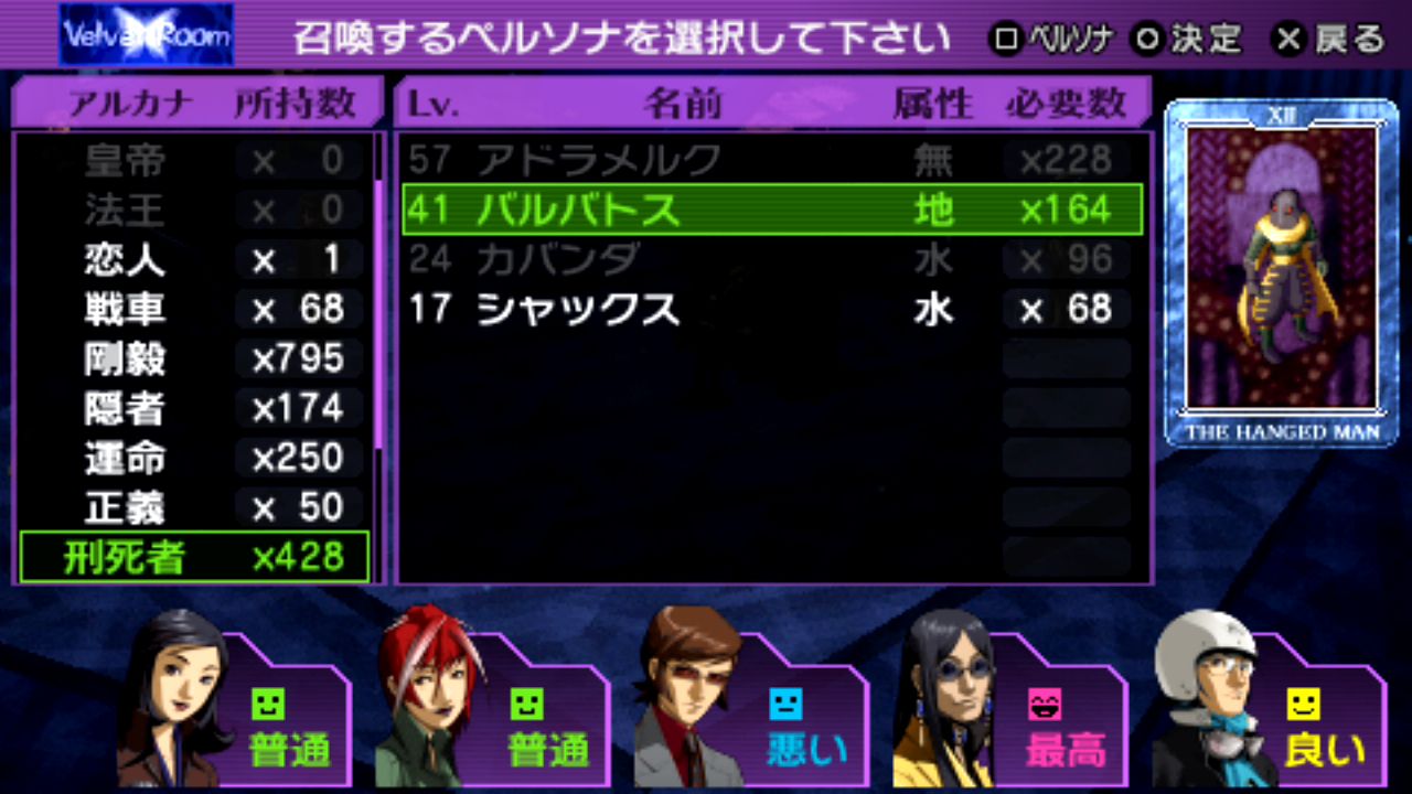 女教皇シフLv.34、女帝セイオウボLv.36、塔ロキLv.36、皇帝バールLv.37、節制スチュパリデスLv.37、星ヘーニルLv.38、世界ニヨルドLv.38、法王ヤマLv.39、悪魔スルトLv.39、隠者ゲンブLv.40、女教皇パールヴァティLv.41、刑死者バルバトスLv.41、恋人ヴィヴィアンLv.42、塔アエーシュマLv.42、戦車スサノオLv.43、剛毅タクシャカLv.43、死神アンクウLv.44