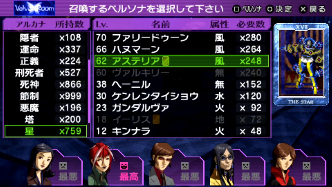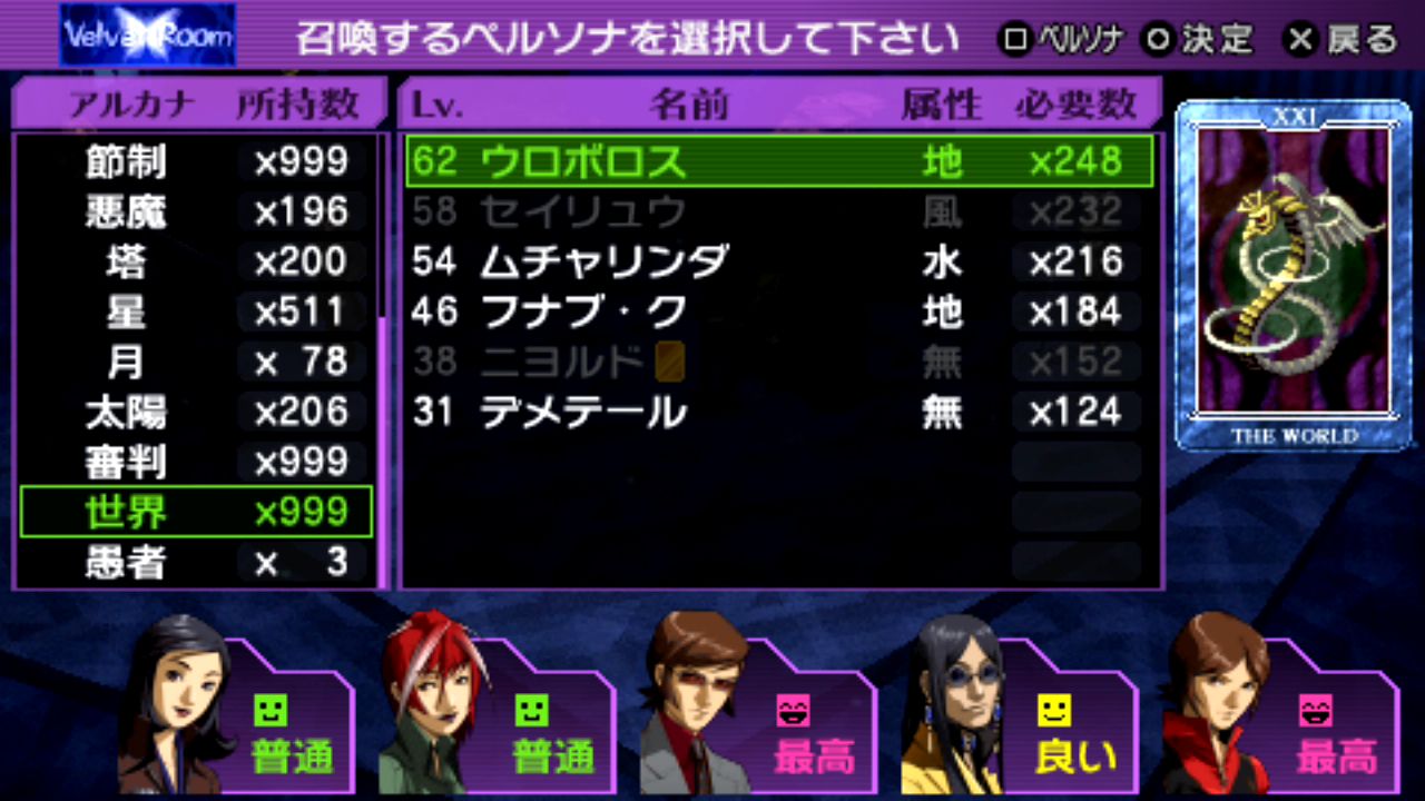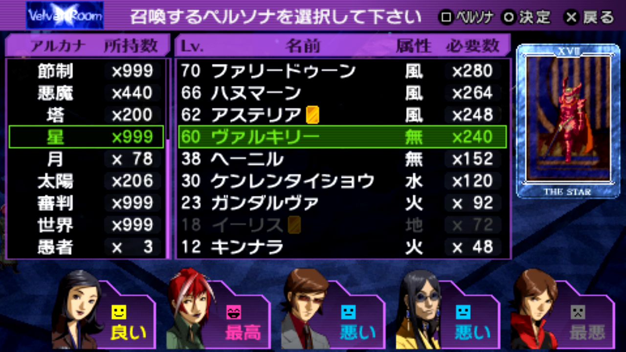 戦車マハーカーラLv.59、星ヴァルキリーLv.60、刑死者プロメテウスLv.61、悪魔ベルゼブブLv.61、魔術師イシスLv.62、星アステリアLv.62、世界ウロボロスLv.62、正義ヒューペリオンLv.63、月アルテミスLv.63、女教皇スカアハLv.64、皇帝オーディンLv.65、剛毅ウォンロンLv.68、塔セトLv.68、審判アムルタートLv.69、星ファリードゥーンLv.70、月ナンナルLv.73、運命ギョクコウジョテイLv.77