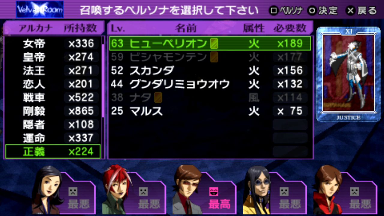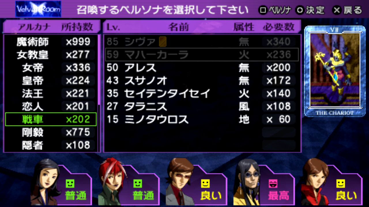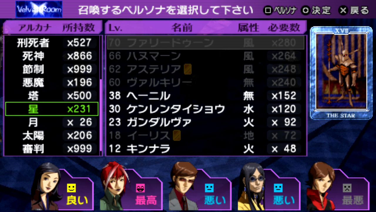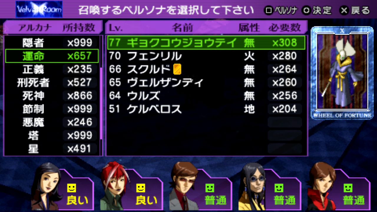 戦車マハーカーラLv.59、星ヴァルキリーLv.60、刑死者プロメテウスLv.61、悪魔ベルゼブブLv.61、魔術師イシスLv.62、星アステリアLv.62、世界ウロボロスLv.62、正義ヒューペリオンLv.63、月アルテミスLv.63、女教皇スカアハLv.64、皇帝オーディンLv.65、剛毅ウォンロンLv.68、塔セトLv.68、審判アムルタートLv.69、星ファリードゥーンLv.70、月ナンナルLv.73、運命ギョクコウジョテイLv.77