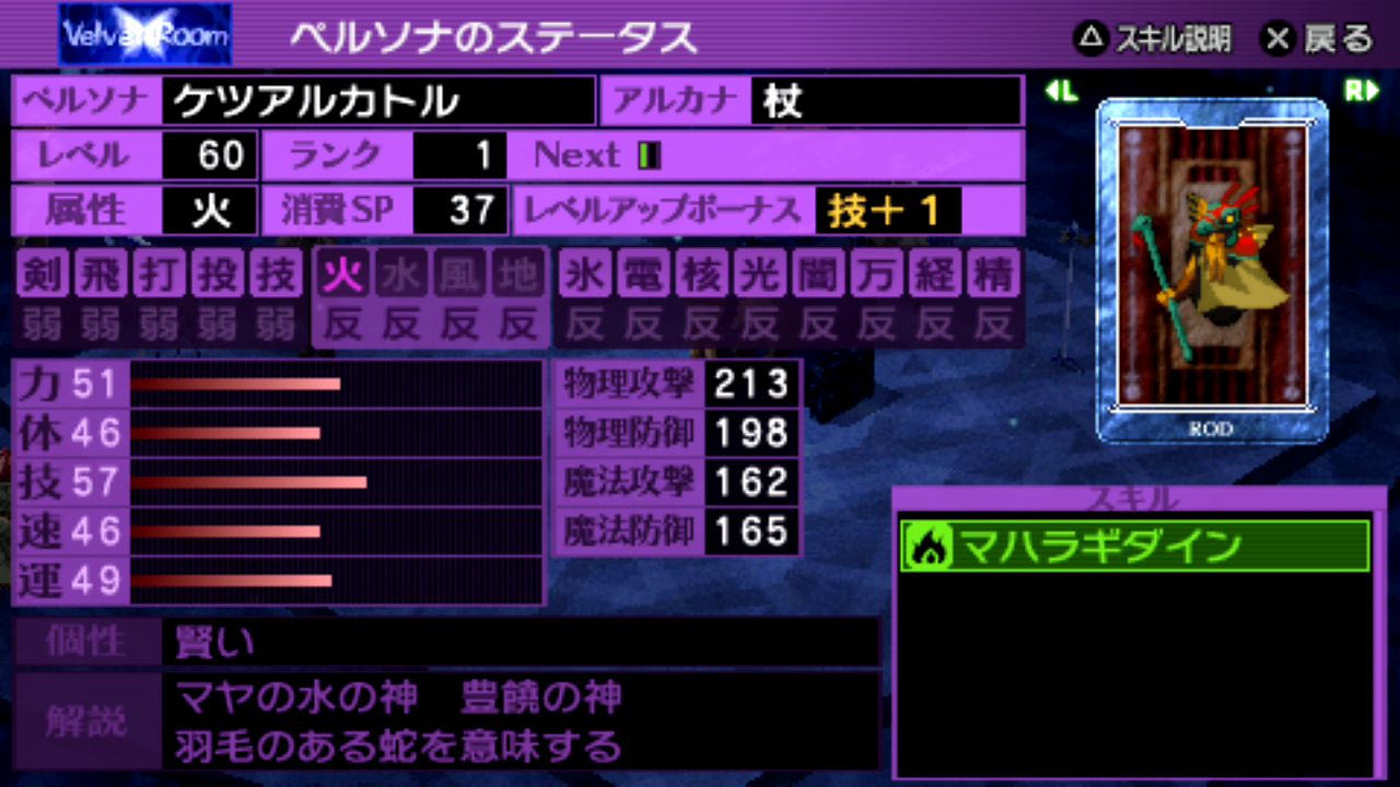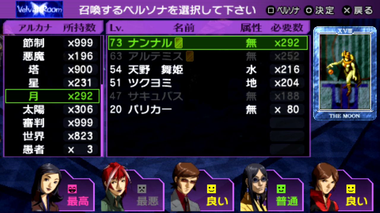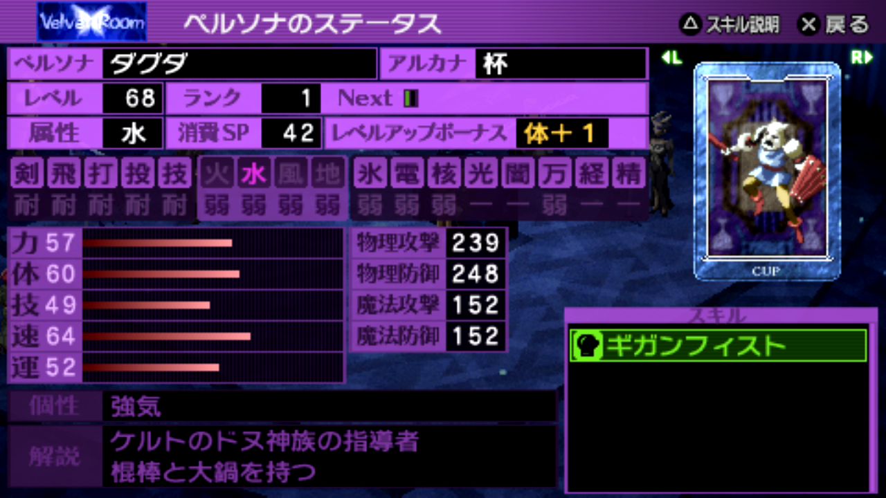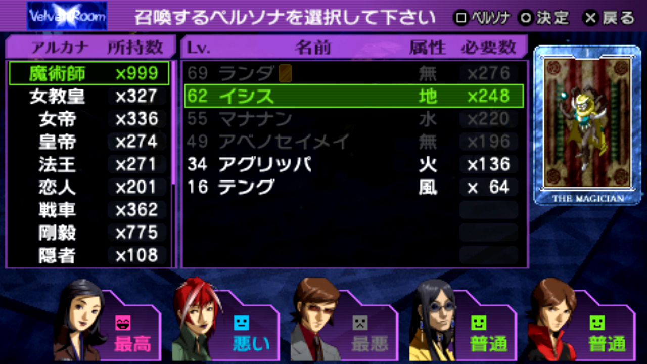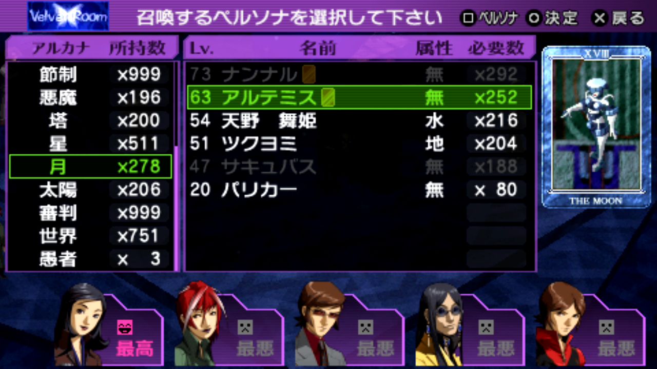 スキル: 這い寄る混沌(全体攻撃+魔封)、アステロイドボム、泡沫の波紋(デカジャ)、運命の車輪(ペルソナ変更不可)、闇の審判、攻撃