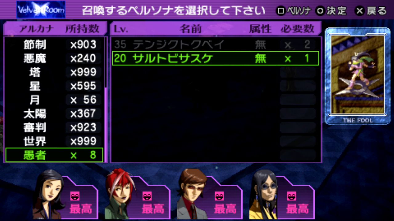 刑死者シャックスLv.15、節制フィアラルLv.19、月パリカーLv.20、愚者サルトビサスケLv.20、死神ヘルLv.22