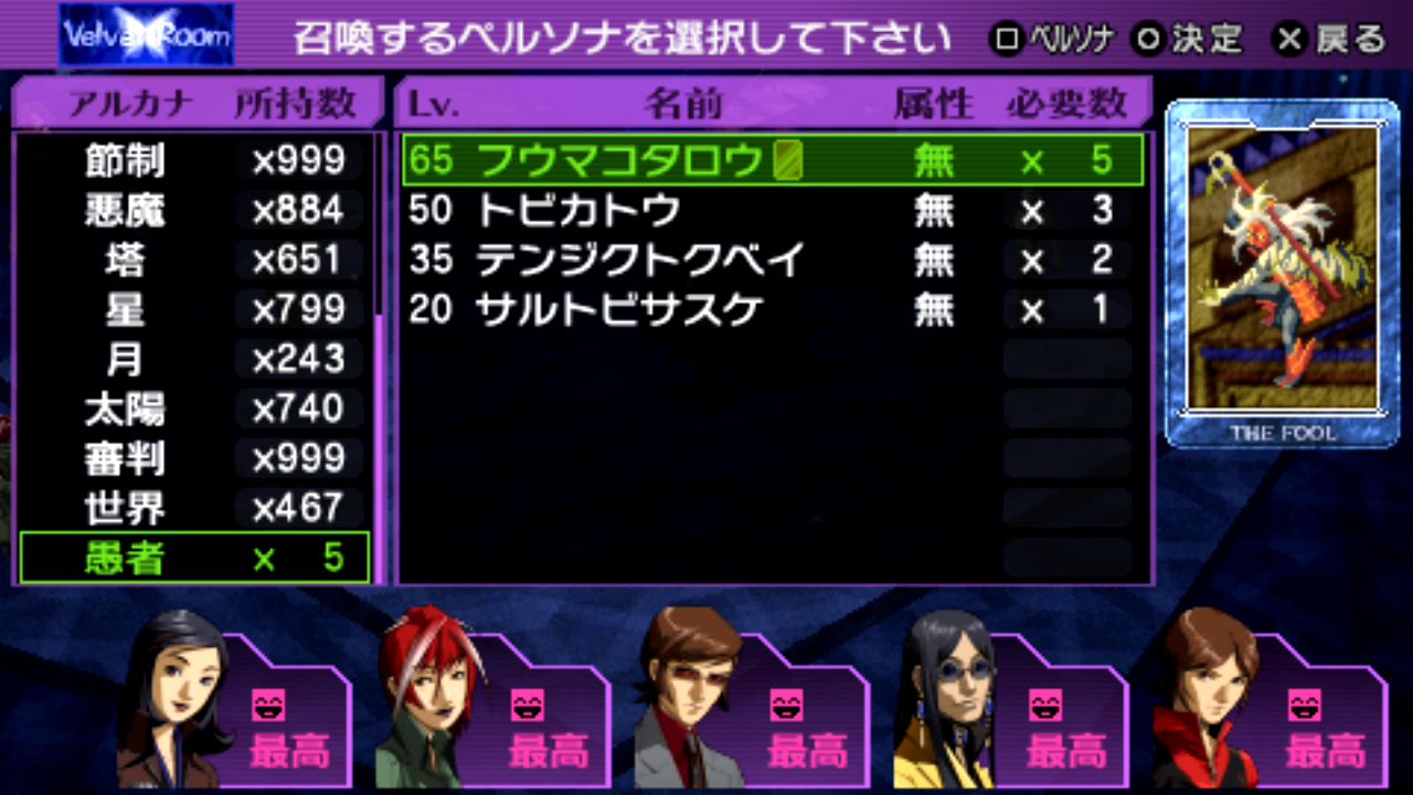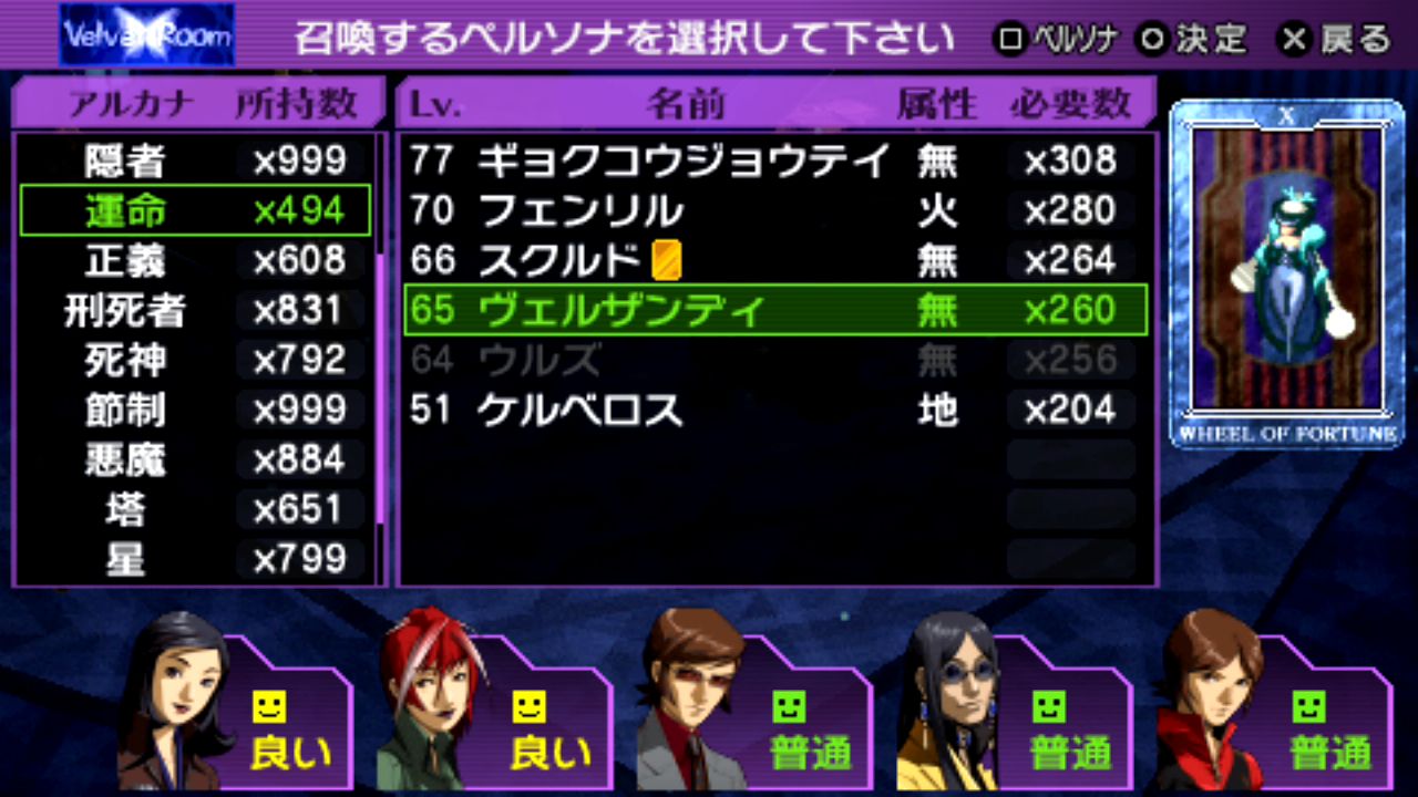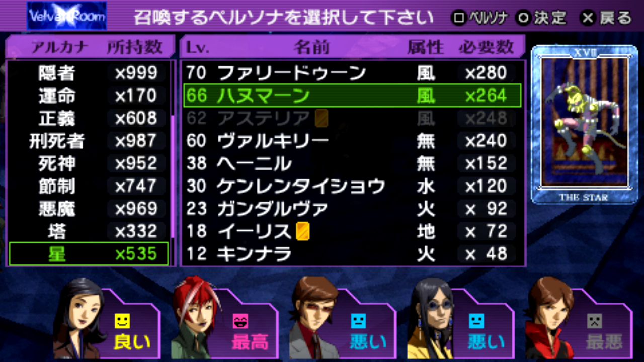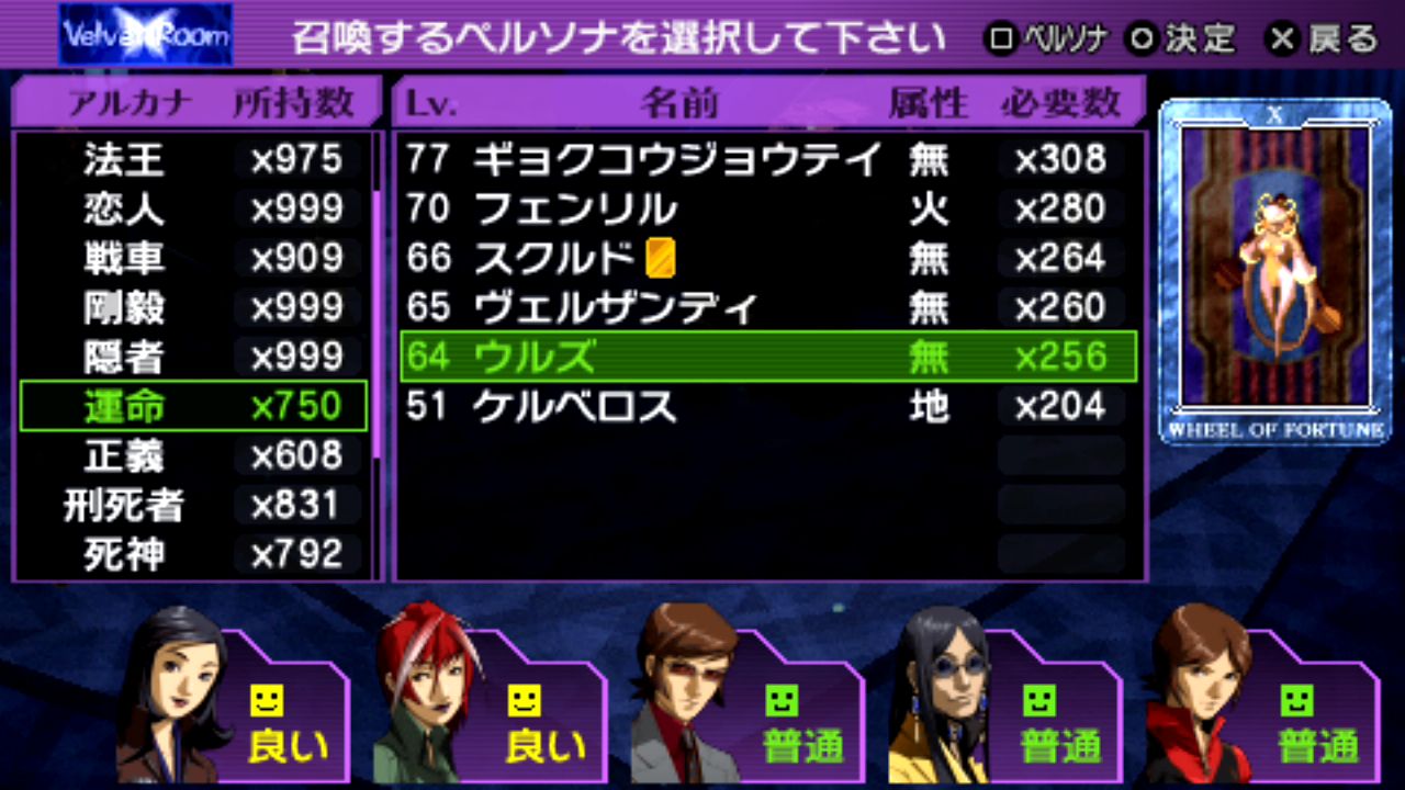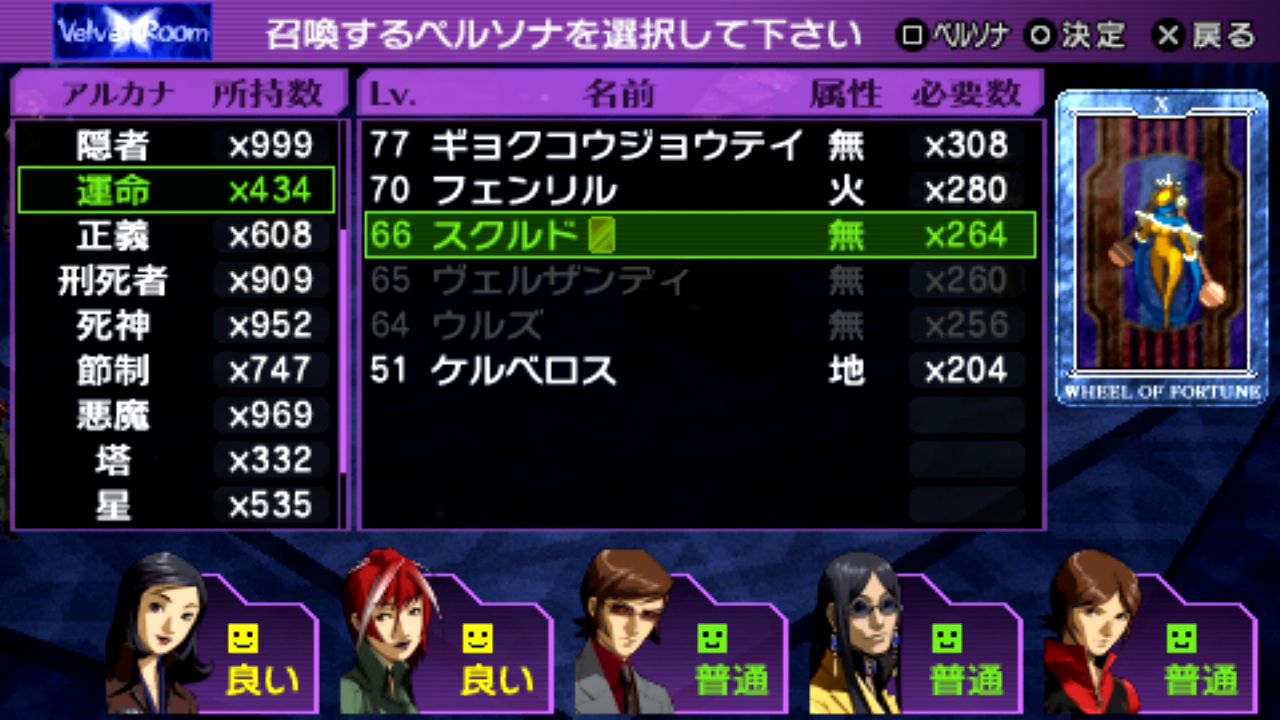 女帝カーリーLv.61、魔術師イシスLv.62、節制スザクLv.63、女教皇スカアハLv.64、運命ウルズLv.64、皇帝オーディンLv.65、運命ヴェルザンディLv.65、愚者フウマコタロウLv.65、運命スクルドLv.66、星ハヌマーンLv.66、法王ヴァルナLv.67、塔セトLv.68、審判アムルタートLv.69