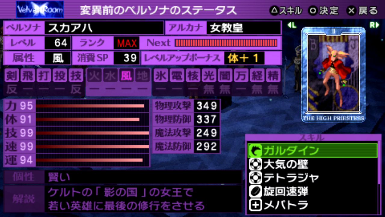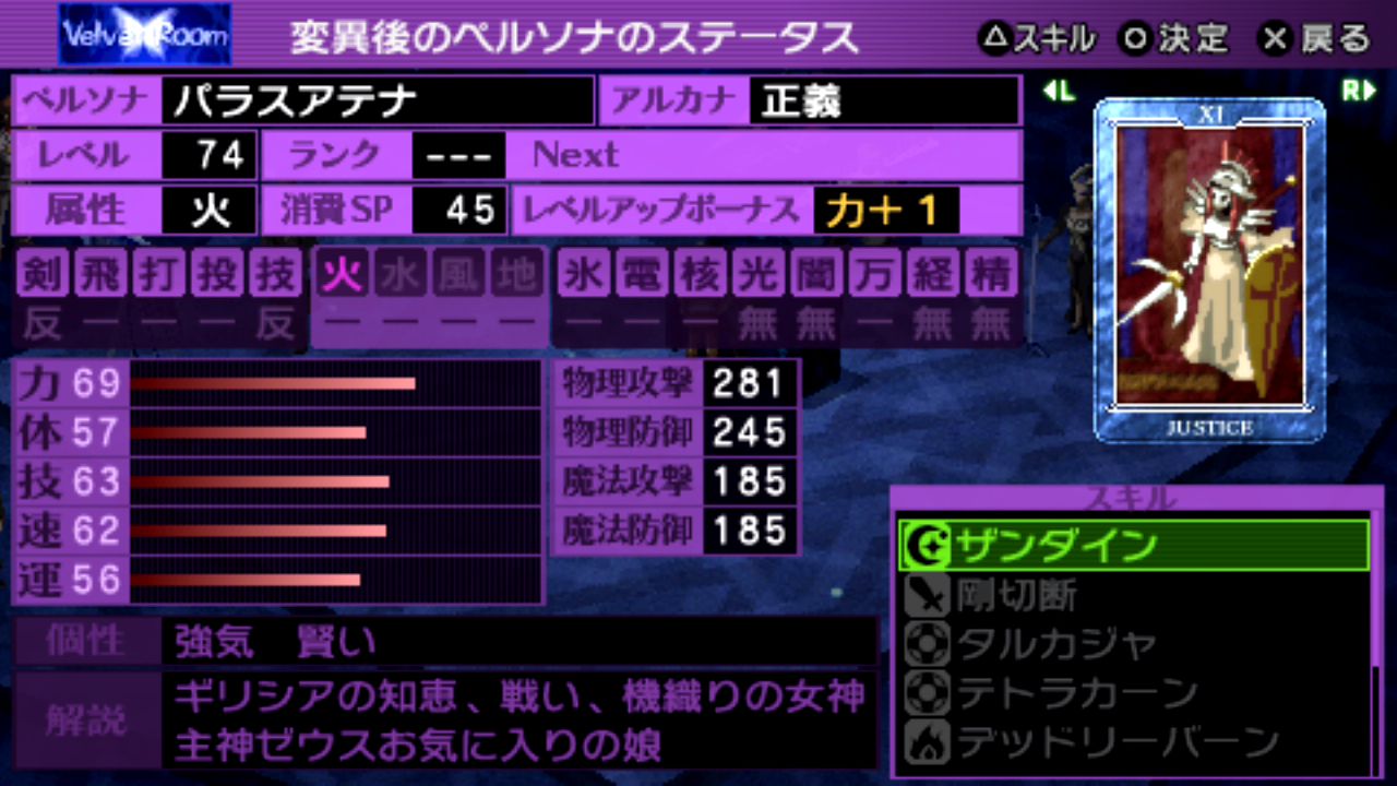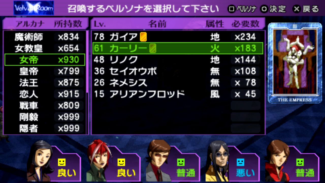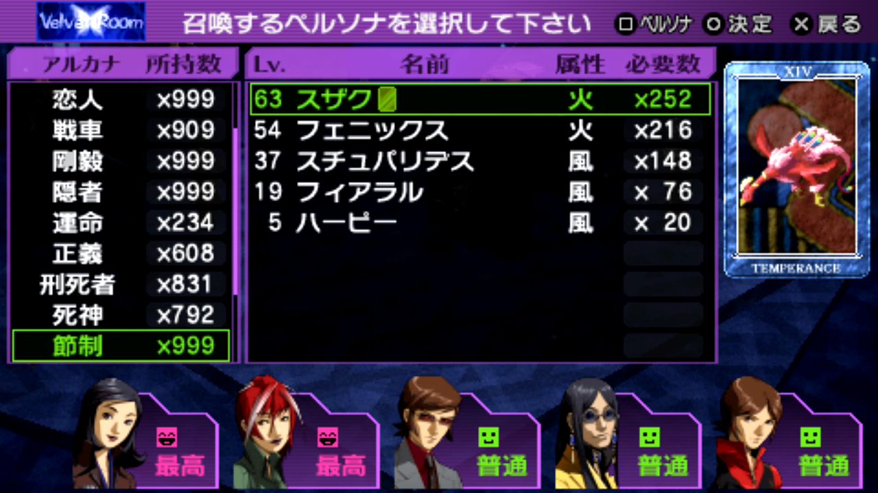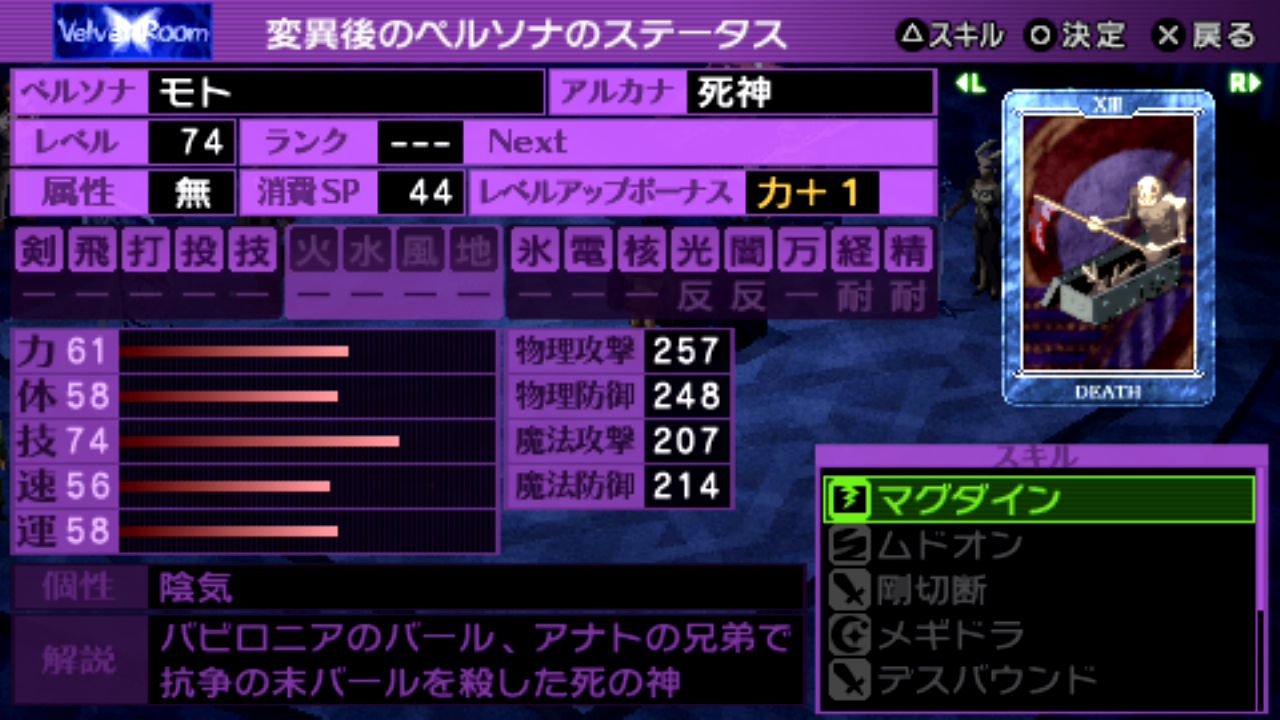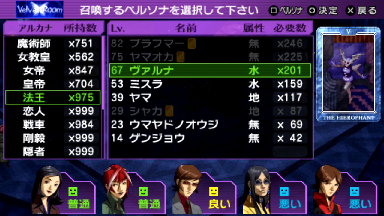 女帝カーリーLv.61、魔術師イシスLv.62、節制スザクLv.63、女教皇スカアハLv.64、運命ウルズLv.64、皇帝オーディンLv.65、運命ヴェルザンディLv.65、愚者フウマコタロウLv.65、運命スクルドLv.66、星ハヌマーンLv.66、法王ヴァルナLv.67、塔セトLv.68、審判アムルタートLv.69