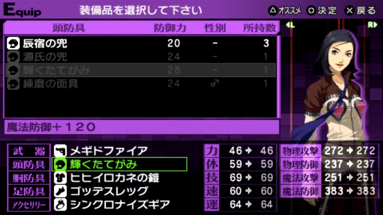 氷結弱点、疾風吸収。ペルソナはアルテミスとイザナミを用意し、マカカジャ→合体技アイスクラッシュ辺りで楽勝。到達Lv.68