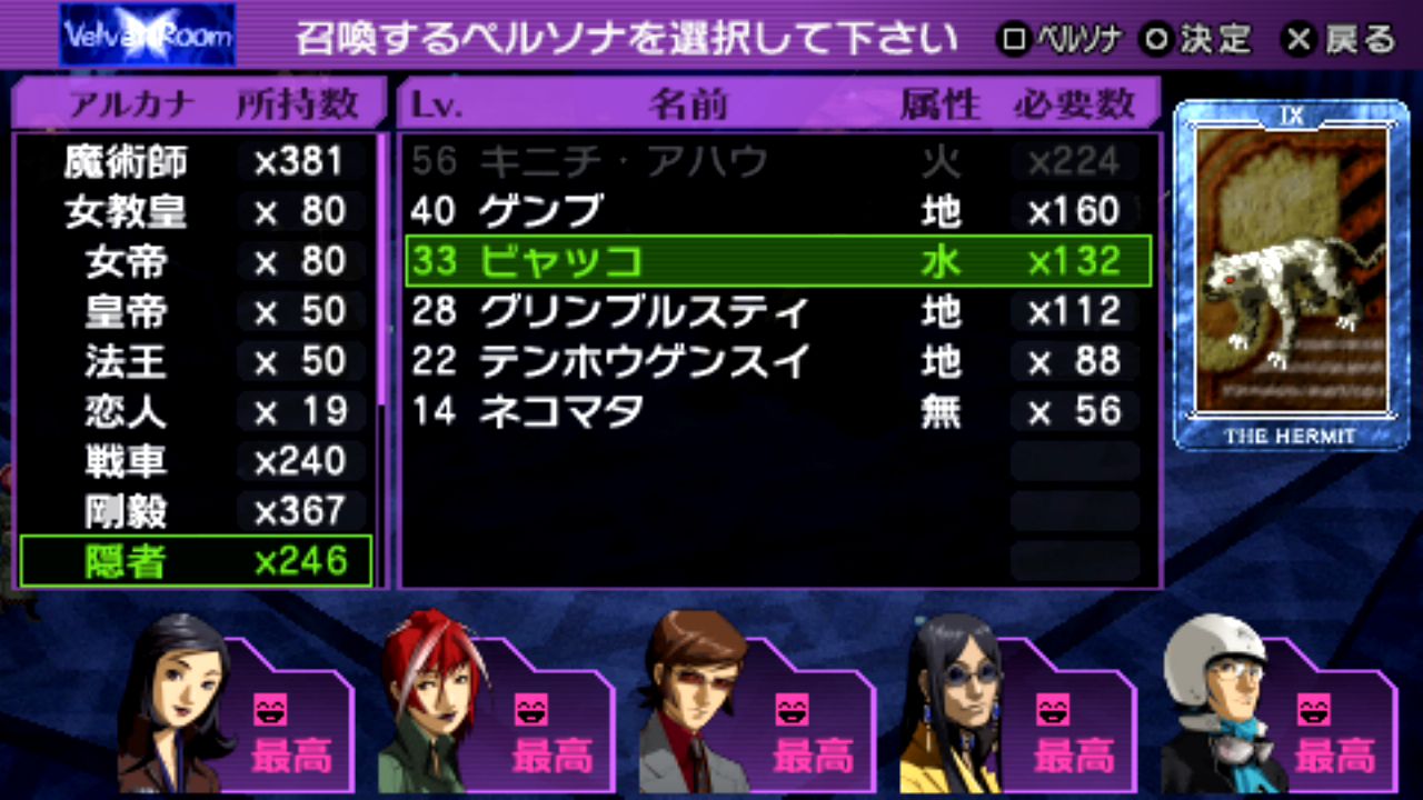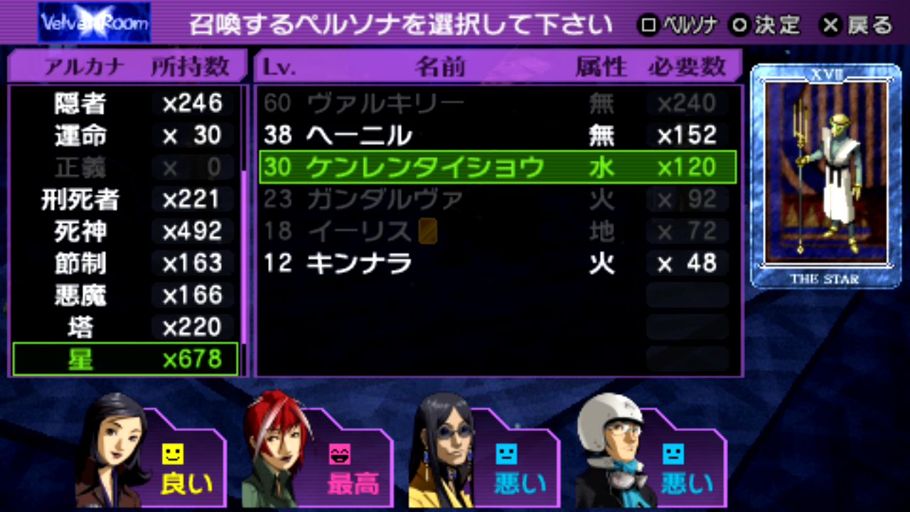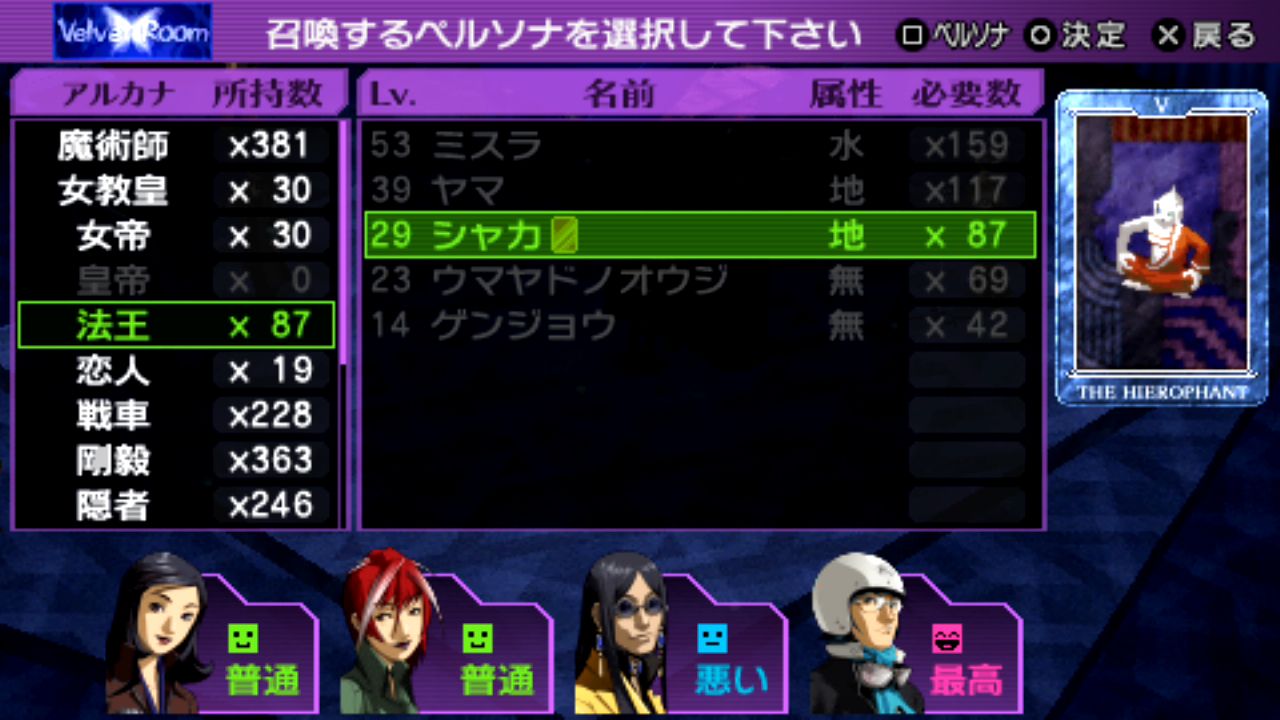 法王シャカLv.29、剛毅クエレプレLv.29、星ケンレンタイショウLv.30、審判メルキセデクLv.32、隠者ビャッコLv.33