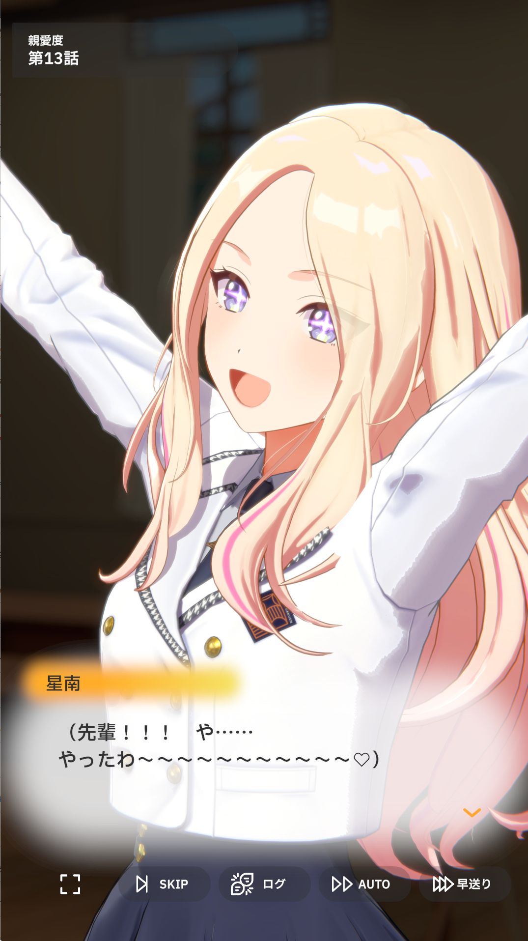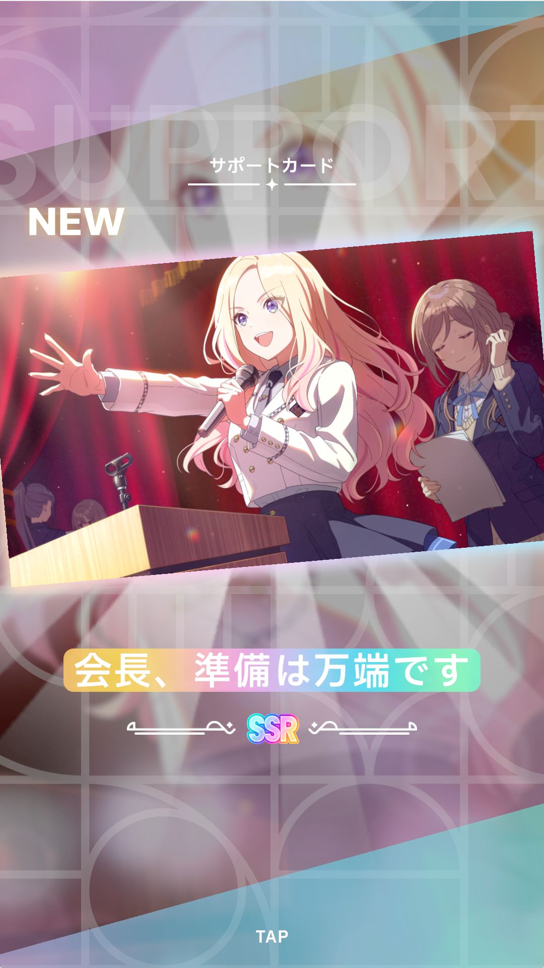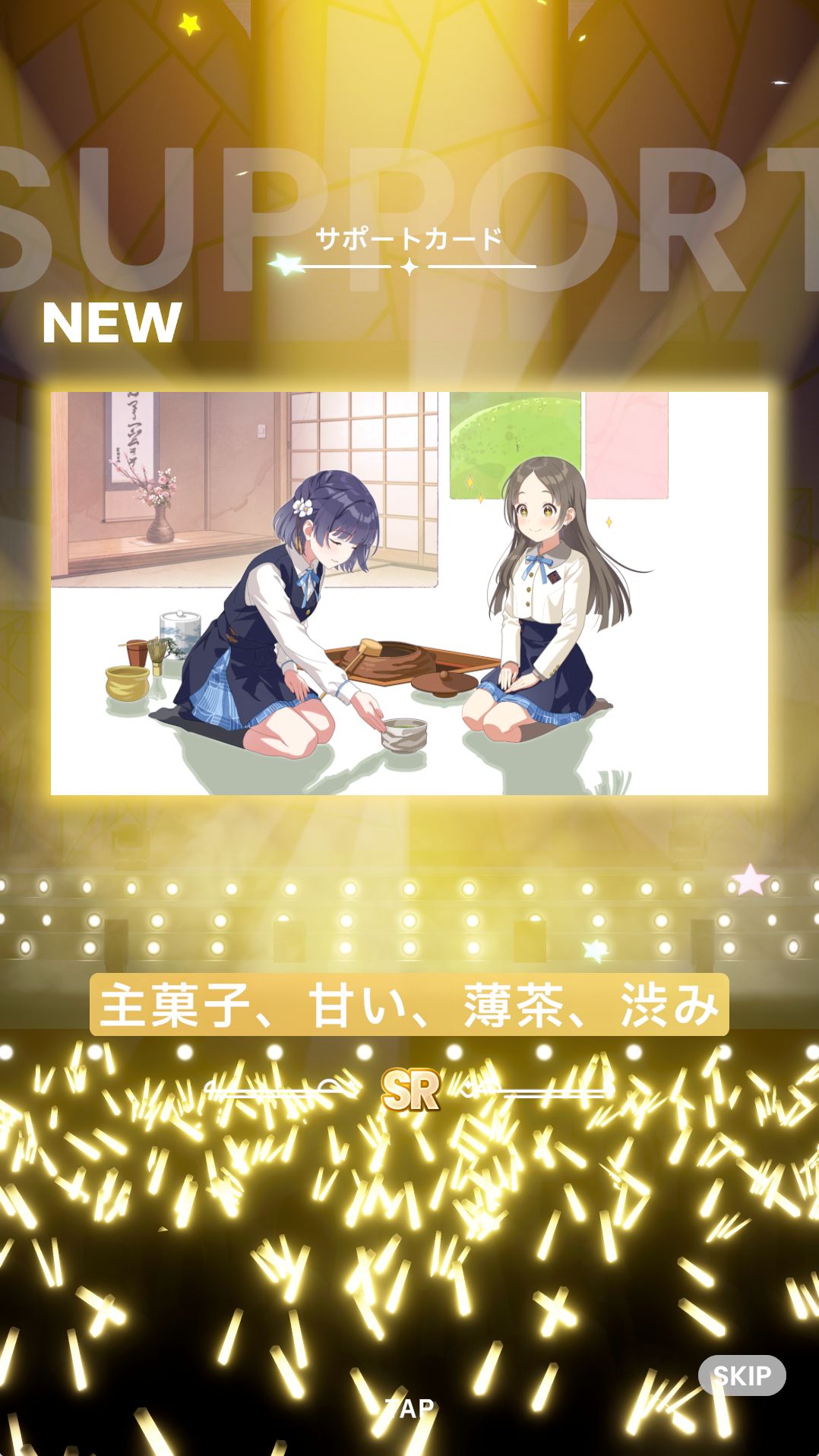 SSR会長、準備は万端です、R憧れを目指して×3、R[学園生活]有村麻央、R枝毛をくるり、R念入りにストレッチ、SSR[ようこそ初星温泉]倉本千奈、R全力、その後、SR[カワイイ♡はじめました]藤田ことね
