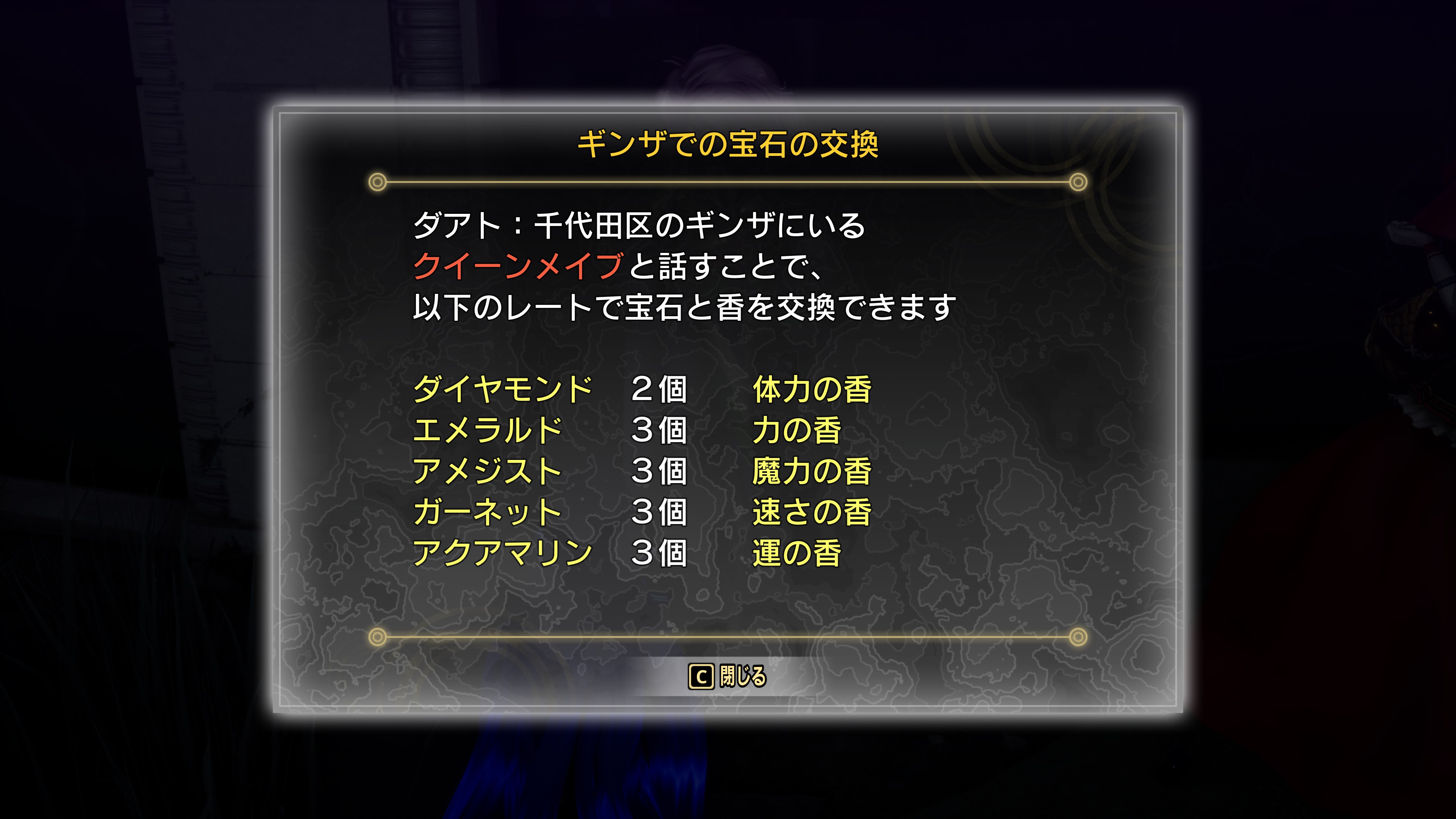 ギンザの時計台の近くにいるクイーンメイブと話すと発生。ダイヤモンド×2、ガーネット×3、アクアマリン×3を納品する。報酬は魔導書×3、EXP14000。以降、宝石と香を交換できる。