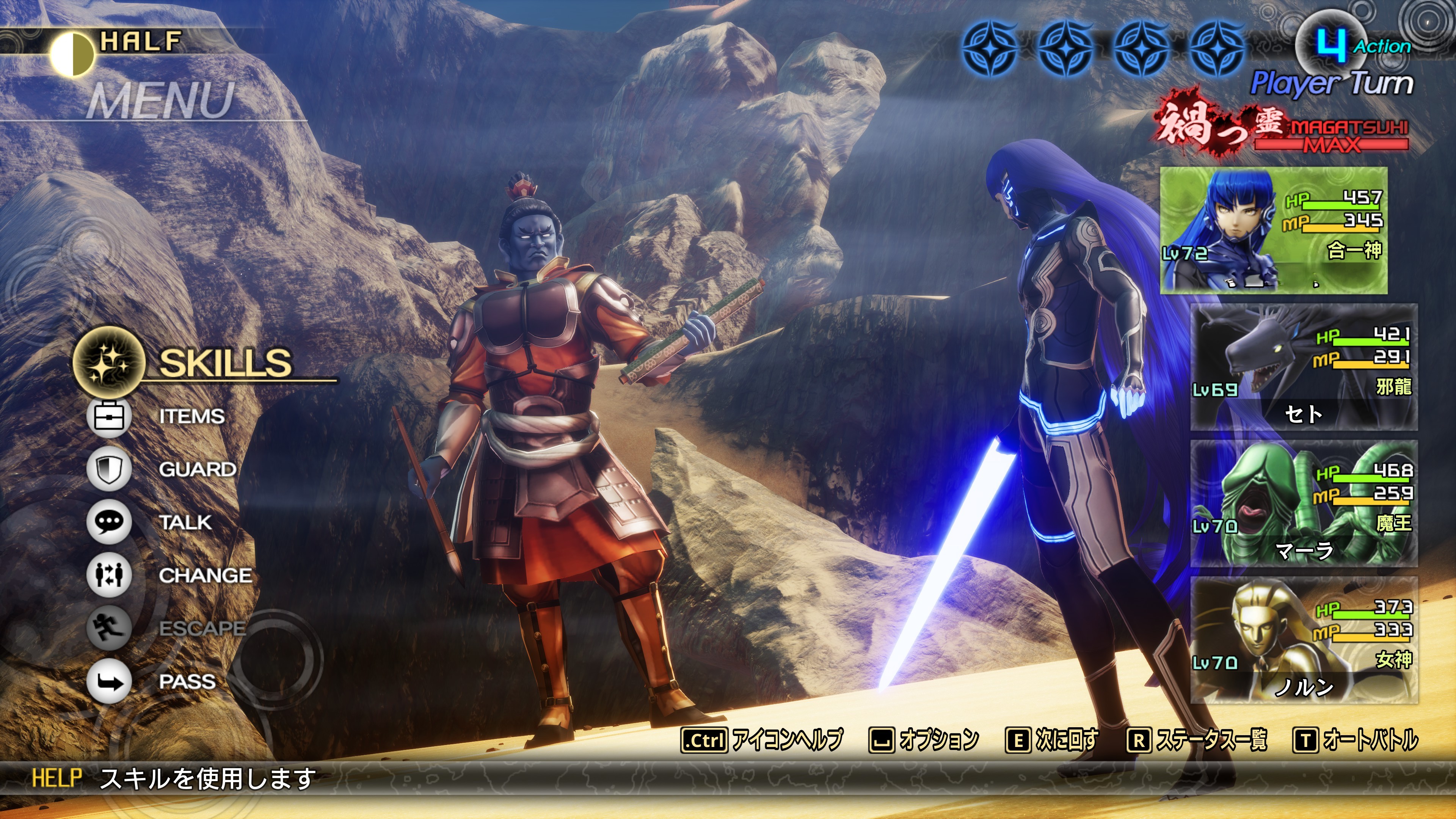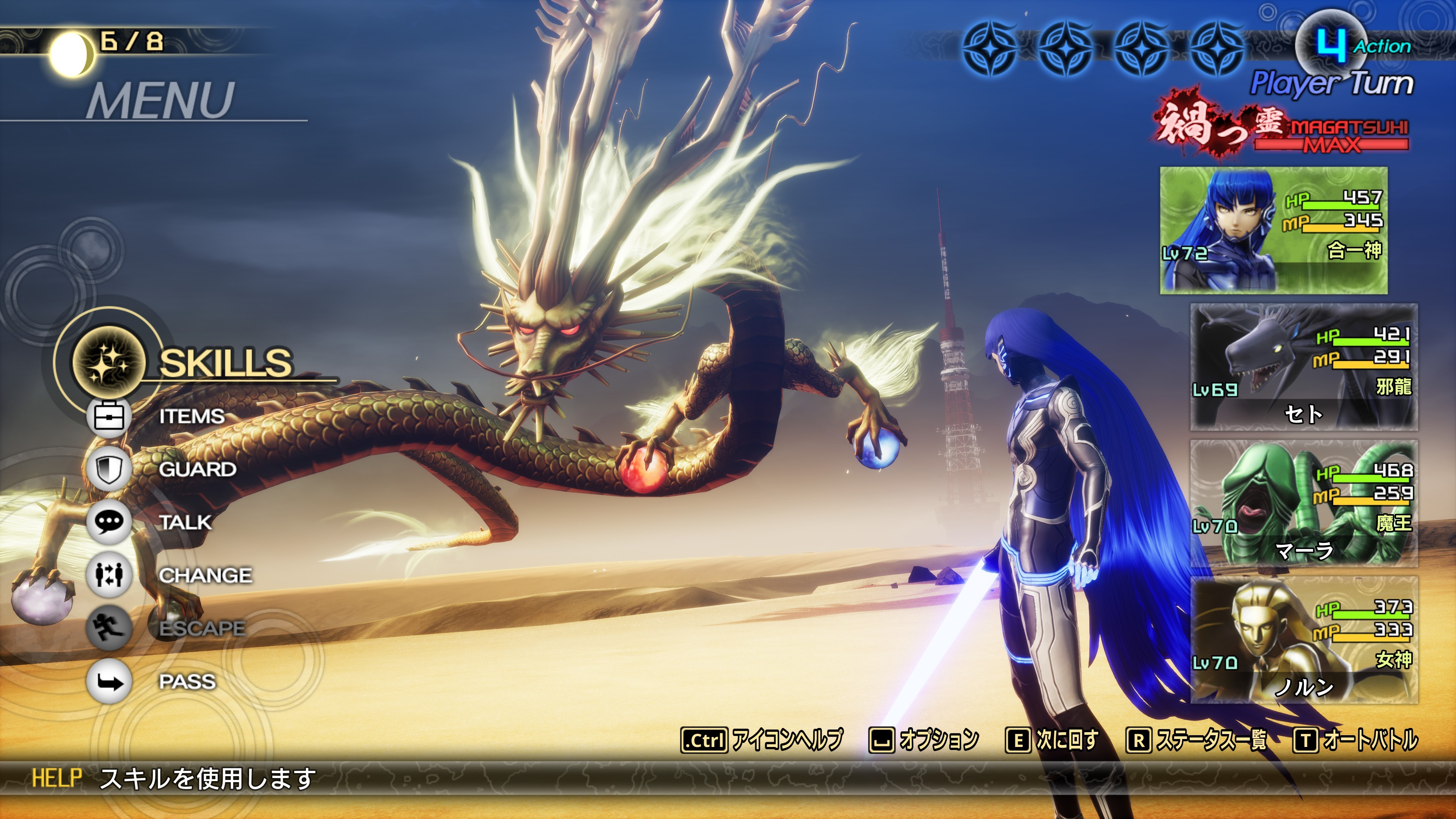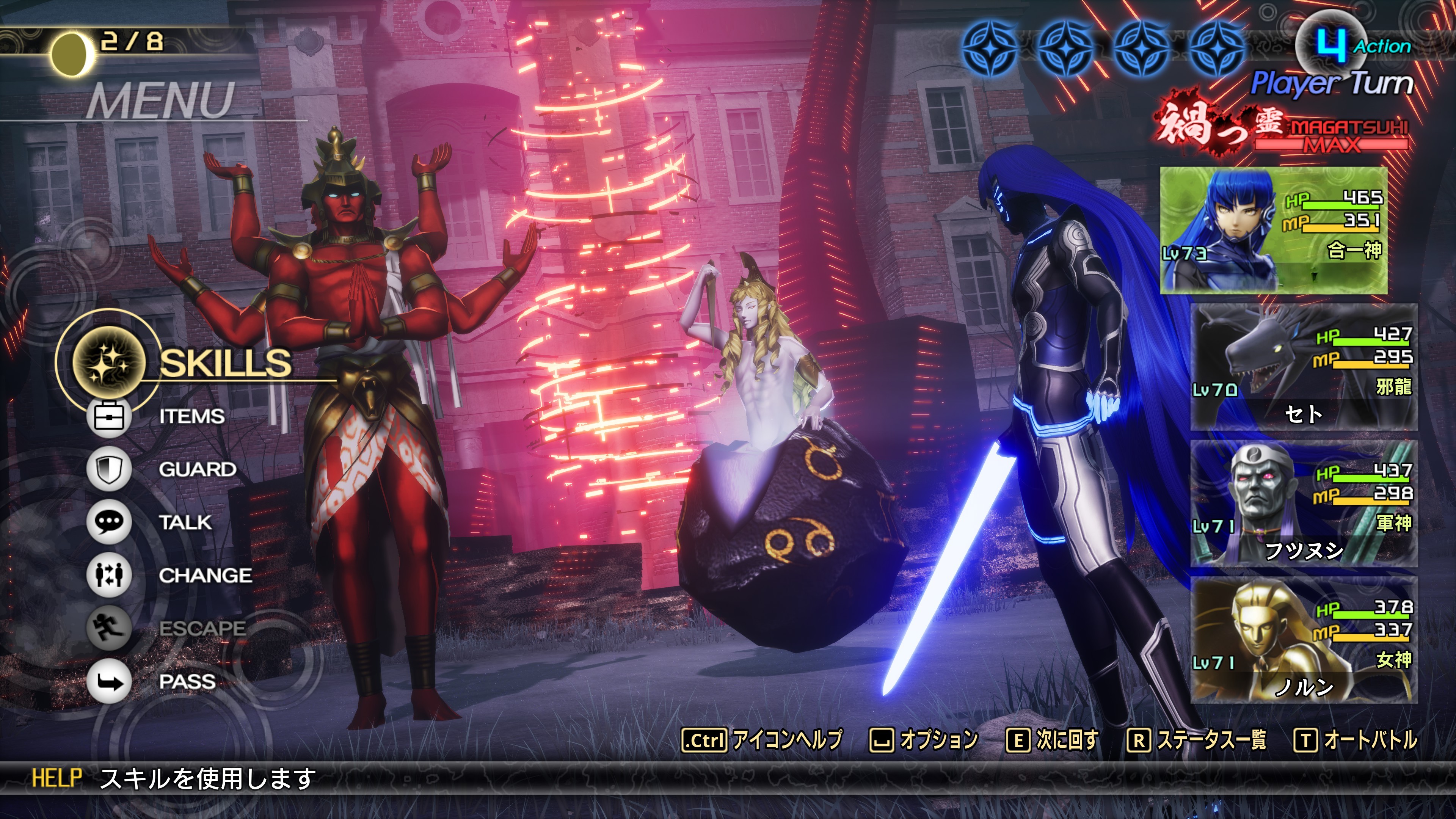 スキル: <コウリュウ> 仲魔を呼ぶ (龍神ゲンブLv65、聖獣ビャッコLv65)、メギドラオン、マハザンダイン、マハラギダイン、マハジオダイン、マハブフダイン