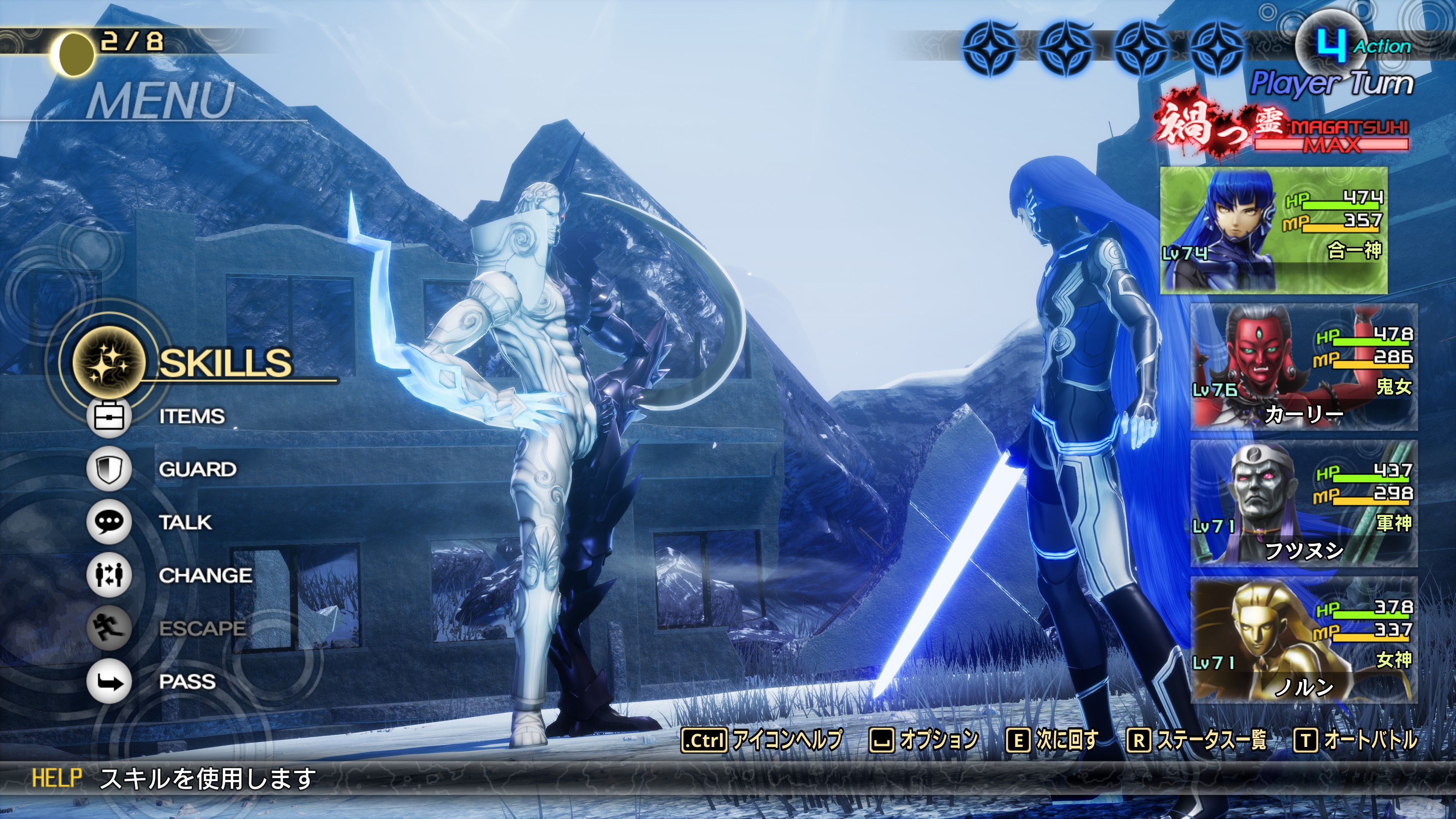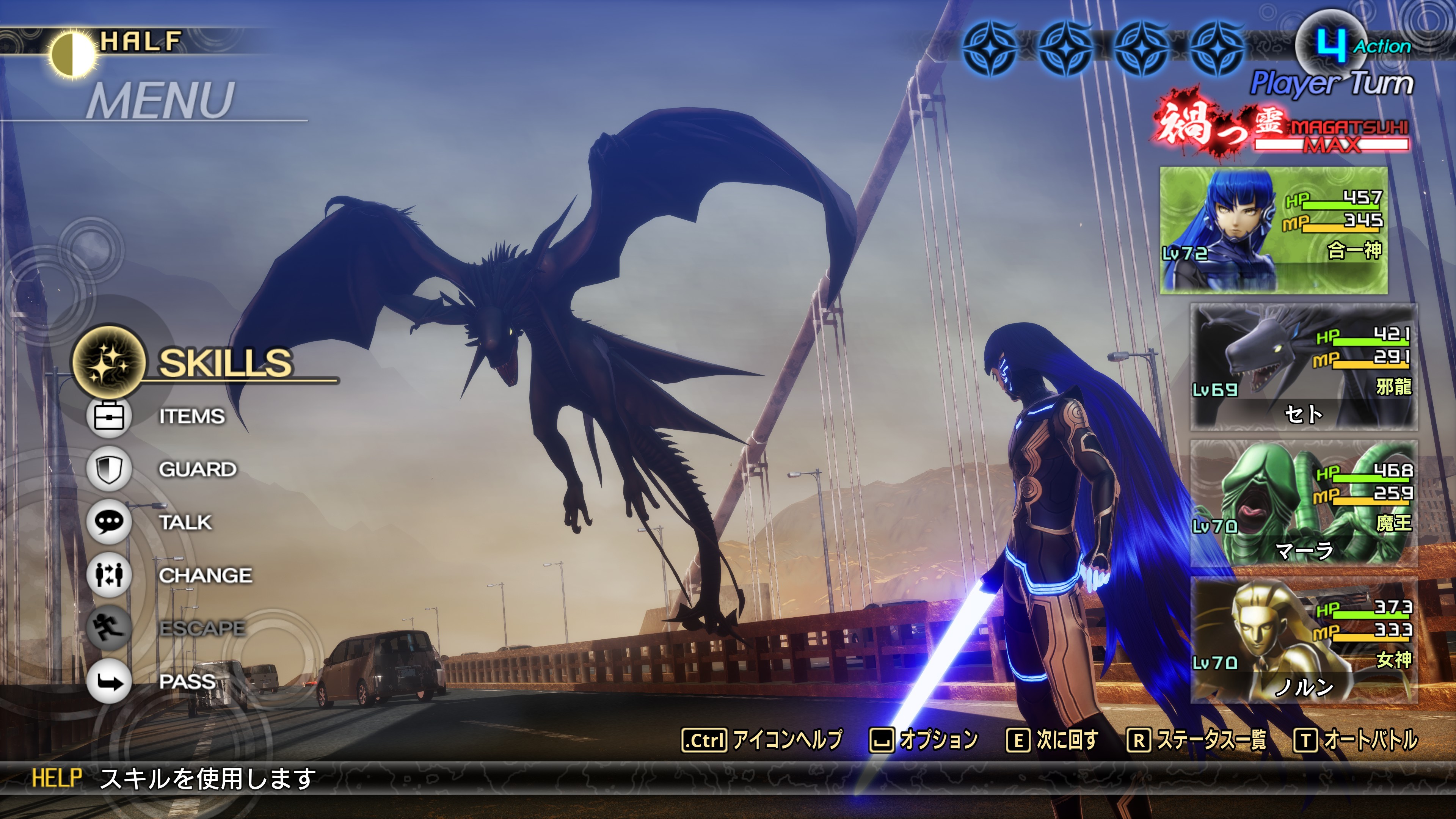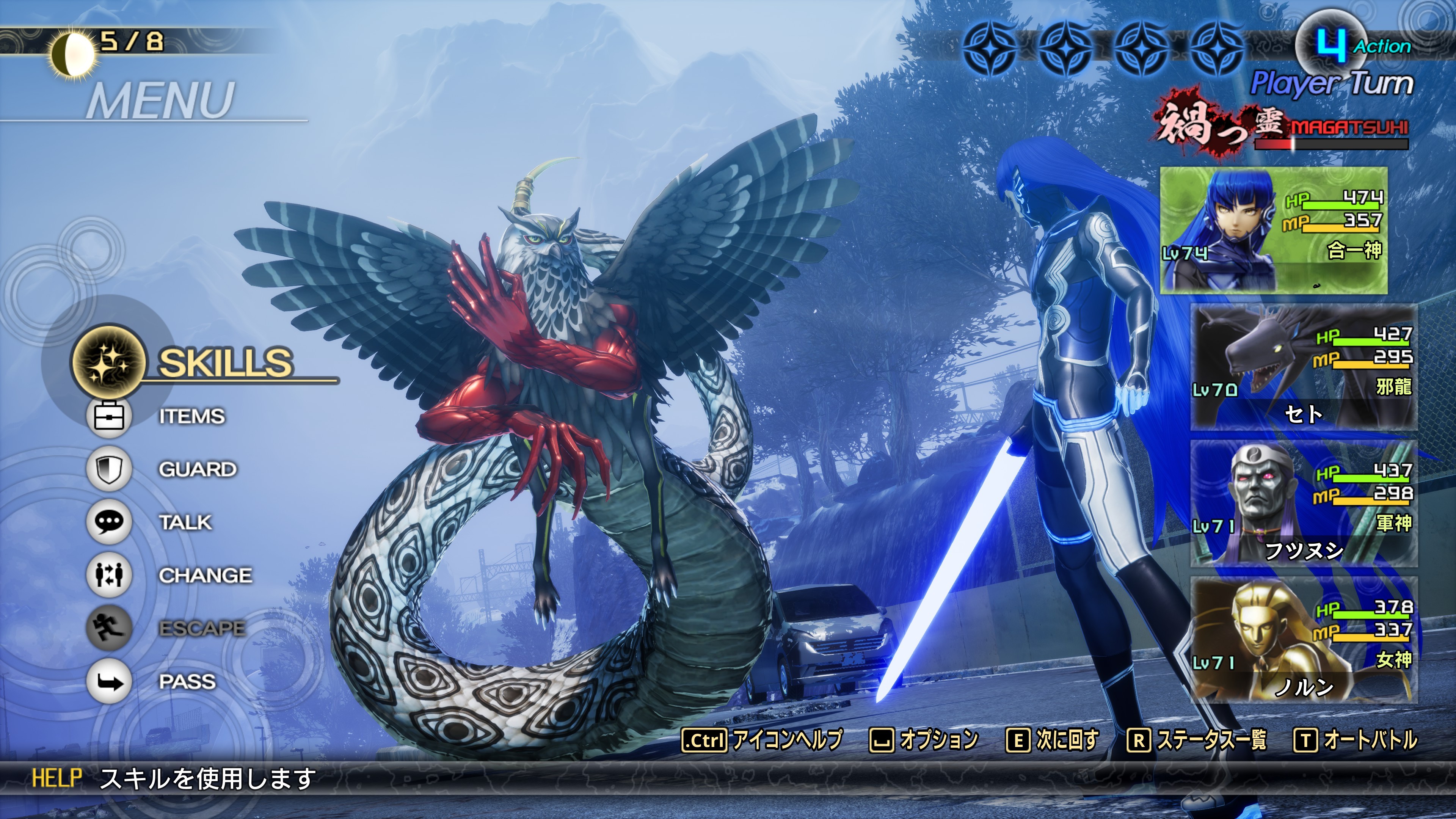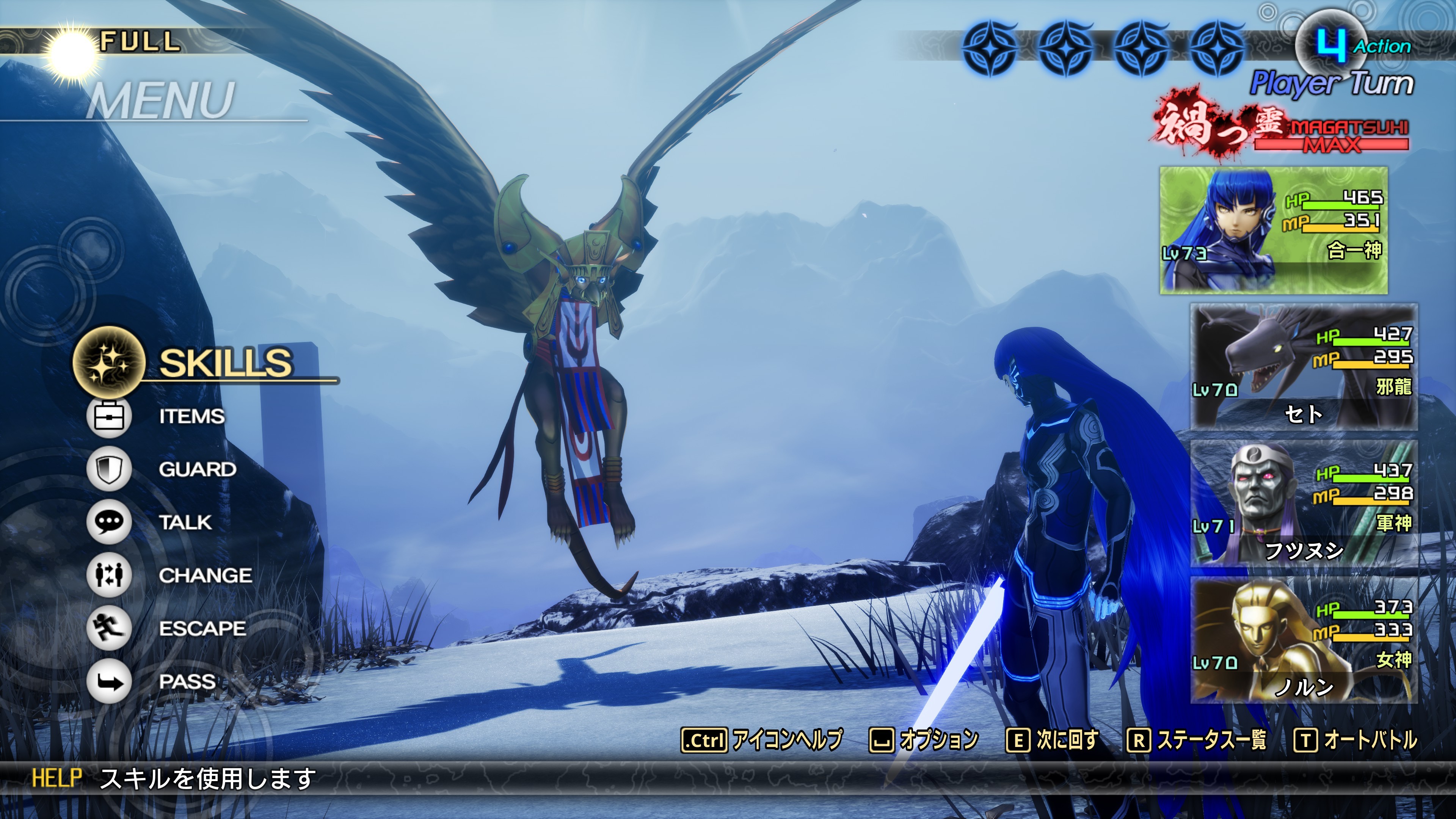 スキル: <コウリュウ> 仲魔を呼ぶ (龍神ゲンブLv65、聖獣ビャッコLv65)、メギドラオン、マハザンダイン、マハラギダイン、マハジオダイン、マハブフダイン