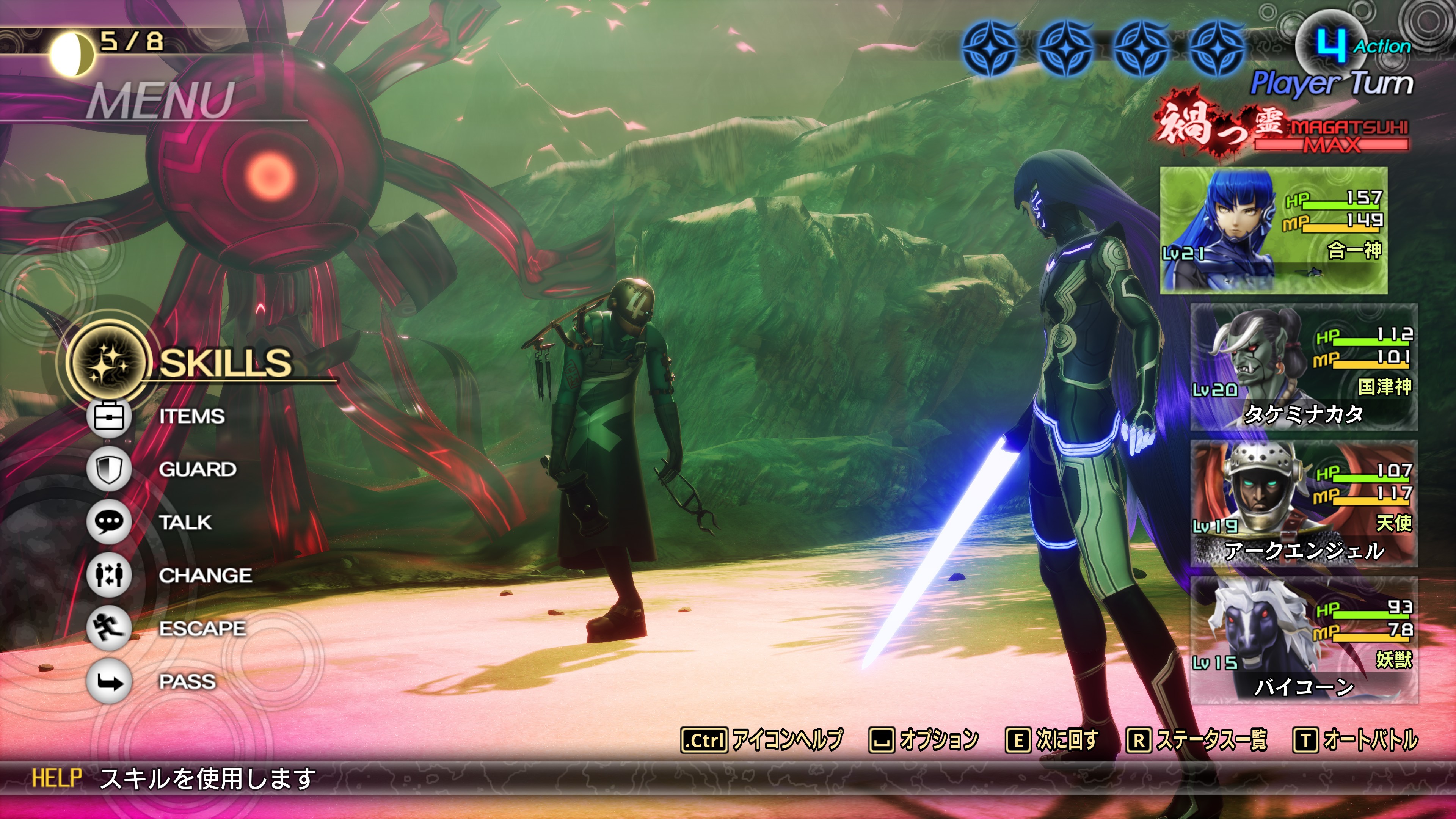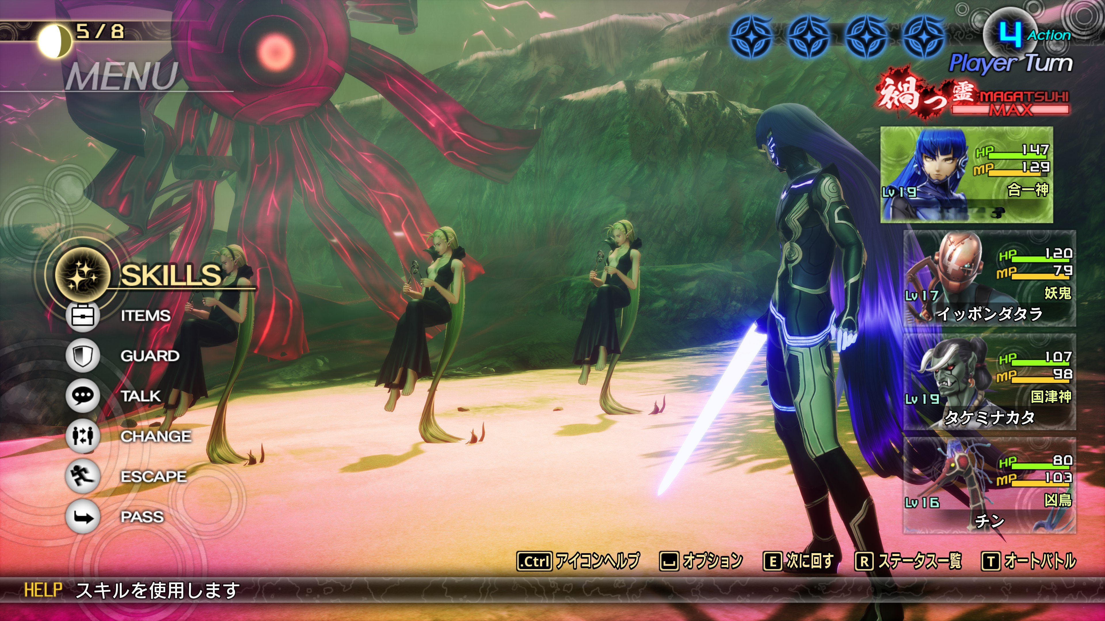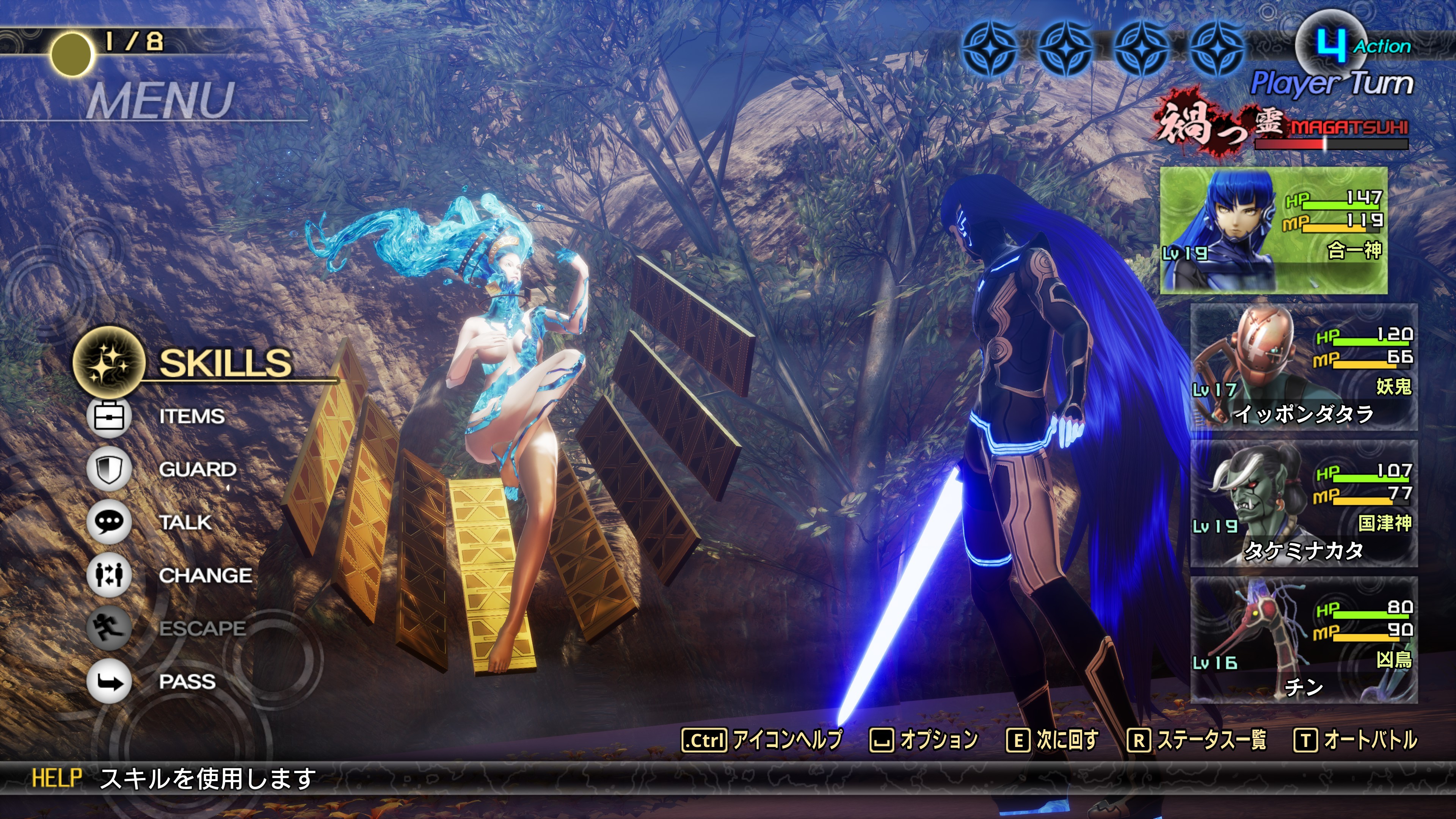 火炎・電撃弱点、氷結吸収、破魔無効。基本はブフだが、マガツヒ後、ヘルスプラッシュを使う。HPが赤くなると補助も使い出す。到達Lv19。