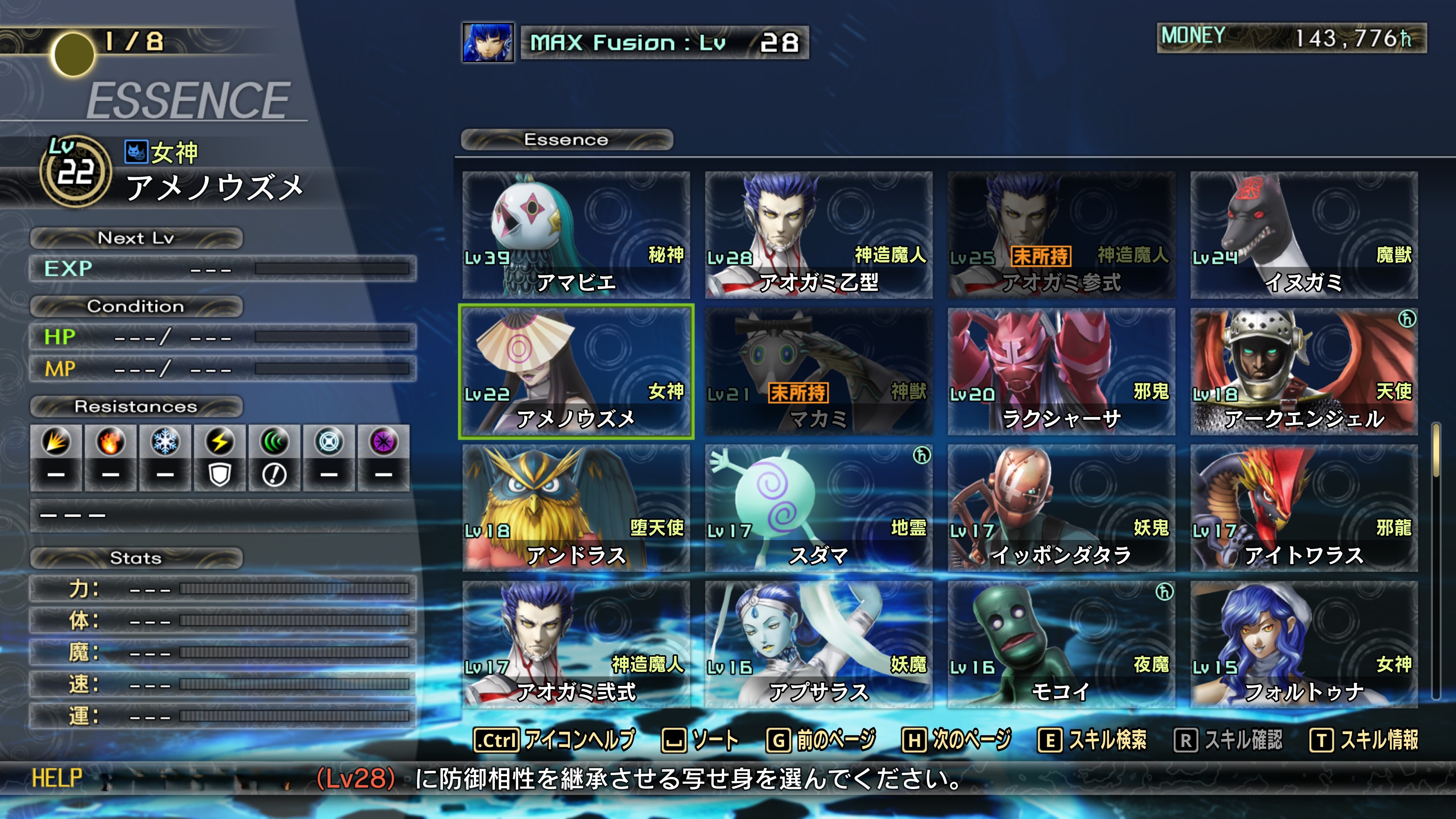 悪魔: 堕天使アンドラスLv18、外道レギオンLv19、妖精ジャックランタンLv20、龍王ヴィーヴルLv20、邪鬼ラクシャーサLv20、地霊カヤノヒメLv21、夜魔インキュバスLv22、妖鬼オニLv23、妖魔コッパテングLv24